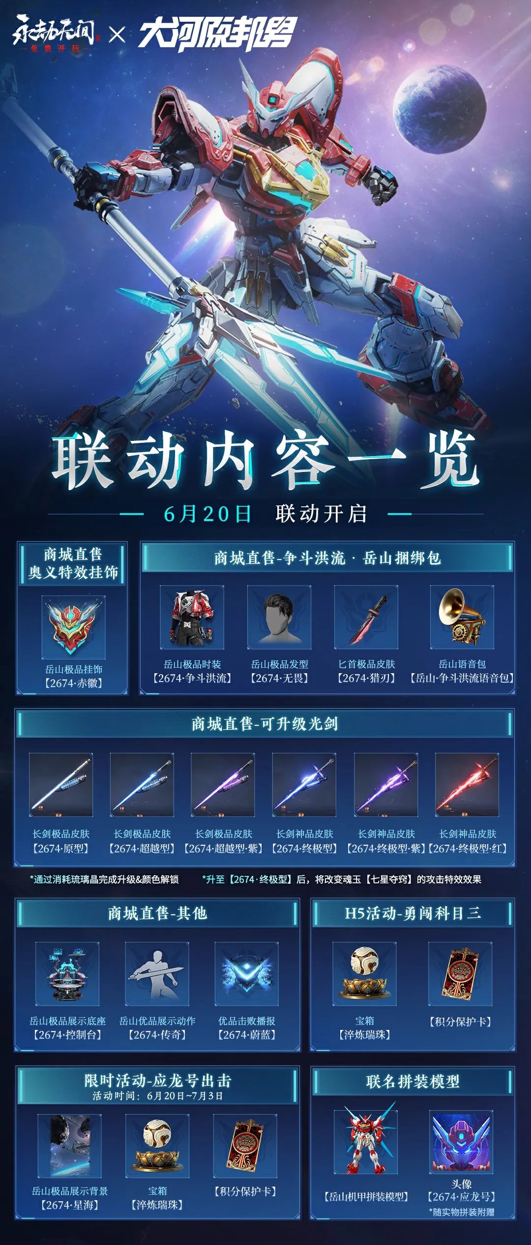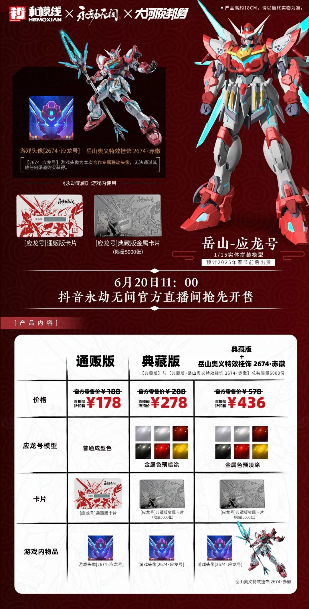 全新娱乐模式,变身系奥义大混战! 全新娱乐模式【创战的大地】即将登场,岳山携手天海对抗沈妙与哈迪的阵营积分战玩法,每位英雄的奥义都在该模式下更加强力。 在规定时间内尽可能击败更多敌人来获取胜利吧! 【抖音直播间专场】 机甲、泳装限时售卖 联名拼装模型 应龙号突破次元壁! 说到机甲怎么能少的了拼装模型呢?在研发过程中,我们同步与知名国模品牌“和模线”合作,将“应龙号”作为拼装模型带到三次元和大家见面。 由永劫无间携手和模线推出的1/15 应龙号 实体拼装模型,明日直播间独家首发预售,更有限定优惠和捆绑包等着大家!爱动手的劫宝们千万别错过啦! 夏日派对系列