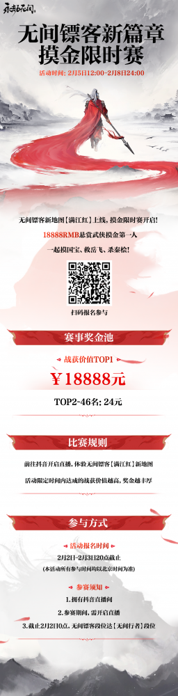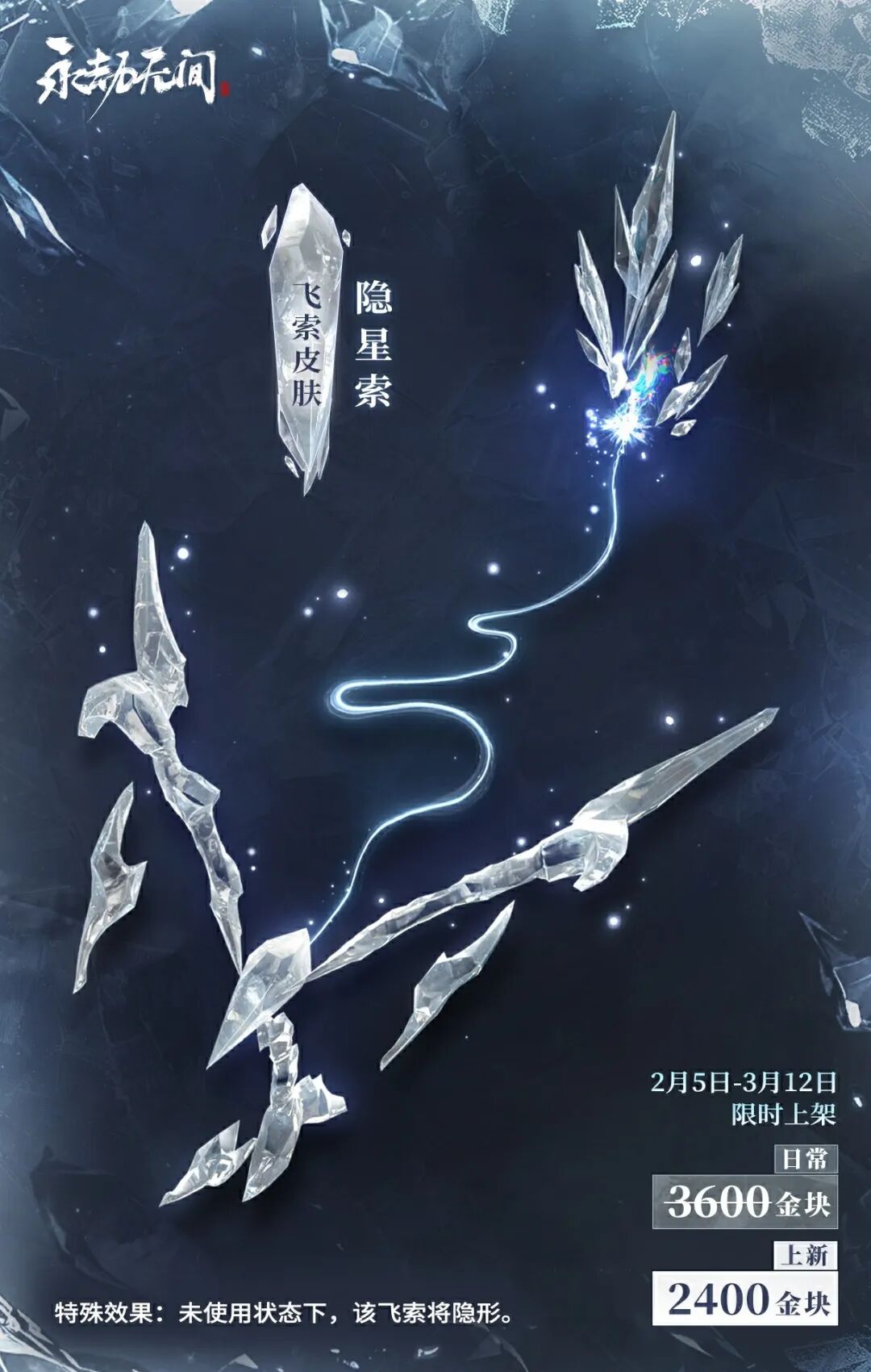 全新飞索皮肤【隐星索】2月5日-3月12日限时上架!未使用飞索状态下,该飞索将隐形。 还有超可爱的各种表情饺饺头套同步上架商城,仅需6元! 2月5日新春版本即将开启! 更多详细内容一起跟劫宝来看看吧! 全新飞索外观:隐星索 2月5日更新后——3月12日 限时上架! 原价3600金块 上新价仅需2400金块! 当它被唤醒,便化作一条摇曳的星芒,在夜色中织出无形的路径,引人踏月登楼,如履平地。 它沉睡时,是腕间一缕几不可见的虚影,是名为“隐星”的秘密。 6元饺饺福袋 【饺饺福袋】2月5日同步上架商城!各种表情的可爱饺饺头套等你来获取~ 限购5次,将不会重复获取,全部拿下仅需30元哦! 注意:在聚窟洲奔波时,若感到饥饿,请不要试图咬一口队友的脑袋! 【饺饺福袋】 原价1200金块? ?上新价120金块! 开启福袋后随机获得一款未拥有的【饺饺头套】,【饺饺头套】全英雄通用(妖刀姬除外)。 【萌萌芋饺】 容易走神的小芋饺,脸颊是香芋色的羞赧,眼里盛满了甜甜的白日梦。 【耍酷菜饺】 嘴里叼着一叶青菜,便以为自己是浪迹天涯的侠客,眯起的双眼里,全是它自己编的江湖故事。 【害羞虾饺】 它大概是所有饺子里脸皮最薄的一个,被人多看一眼,整张脸就红得快要熟透了。 【聪明煎饺】 锅底的焦香是它智慧的烙印,有着与其他饺子截然不同的风味。 【挨揍水饺】 鼻青脸肿,眼泪流得像两条小河。在聚窟洲,当一颗可爱的饺子,也是有风险的。 摸金限时赛开启啦! 前往抖音开启直播体验【满江红】,参与无间镖客新篇章摸金限时赛,最高可获得奖金18888元,2月2日-2月3日20:00截止报名,各位英雄快来参加吧! 捆绑包下架提醒 殷紫萍【玉髓冰心·殷紫萍】捆绑包及对应包含内容:时装【共赴无间·玉髓冰心】、发型【共赴无间·云苓】、扇皮肤【海绡绮】均将于2月5日下架!心动的玩家不要错过! 全新飞索外观【隐星索】&【饺饺福袋】 将于2月5日同步上架商城! |