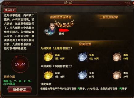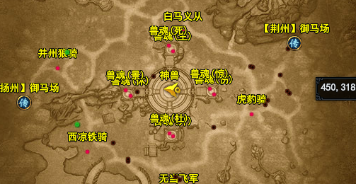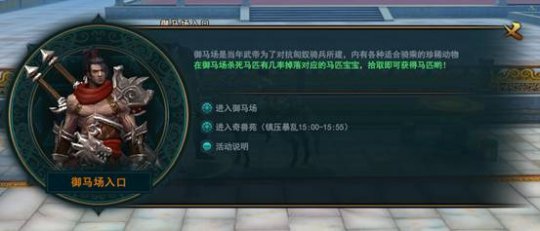 【参拜】 1、活动要求:主角等级达到35级 2、活动地点:洛阳城郊(中立区) 3、活动时间:每天10:00-24:00 4、参拜肖像:皇帝、荆州国王、扬州国王、豫州国王、演武状元、第一勇士、鲜花宝贝、科举状元、迷宫之主、马踏飞燕。 5、参拜方式:点击雕像,进行参拜 【弼马温】 实际等级要求:44级 活动时间:10:00-10:30、22:00-22:30 在王城进入御马场 1、活动期间内,弼马温将在御马场地图中间位置出现(下图显示位置) 2、活动期间内,御马场内的马匹不会掉落任何奖励。 3、伤害前10的玩家将根据排名获得额外奖励。 4、最后一击击杀弼马温的玩家将获得额外奖励。 5、参加本活动有机会获得高级坐骑和坐骑相关道具奖励 6、击杀完弼马温后活动结束。 【国家讨逆】 【玩法简介】 国家讨逆玩法是一个多人组队的副本玩法,必须在组队状态下才能进入,玩家所在的小队需要在副本中抵挡叛军的进攻,保护粮仓,最终击败敌方大将完成讨逆的任务,玩法的开启时间为每天的11时、13时以及14时,开启时长为10分钟,在副本中我们可以获得各种强化材料作为奖励 ? 【进入副本】 首先是进入副本,在王城城区、桃源镇、阳平关和边境都有副本入口,我们需要与一名叫做“叛军密探”的NPC谈话才能进入国家讨逆副本,这个NPC出现的地点并不固定,数量也不止一个,是在活动时间里随机刷在这些区域的,在此之前我们需要先组建好队伍,然后只要队伍中有人与叛军密探进行了对话,经过全体队员确认之后,队伍中的所有人就都会传送到国家讨逆副本中。 【副本流程】 副本的整个流程分为三个阶段 阶段1:抵抗叛军 我们进入副本的时候,正是紧要关头,叛军的部队正准备进攻我方营寨,而我们要做的第一件事便是挡下这波攻势。在这个阶段,每隔60秒就会刷出一波敌人,一共会刷出四波敌人,前三波敌人是普通敌人,而第四波敌人是精英敌人,只要我们讲这些敌人全部消灭,就可以进入下一阶段了。 阶段2:保护粮仓 就在我方集中精力防守营寨正面的时候,叛军动向又变,派出小股部队从侧面偷袭,企图烧毁我们的粮草,这一阶段的任务便自然是保护分布在营寨两侧的粮仓,歼灭来犯之敌,而粮仓的位置在这里: 由于两个粮仓距离太远,整个小队不能抱团防守,便需要兵分两路各守一边。这一阶段的敌人共有四波,每90秒出现一波敌人,前两波只会刷在单个粮仓处,而后两波会在两个粮仓处都刷出敌人。这一阶段的敌人不会攻击玩家,他们的眼里只有粮仓,如果任意一处粮仓被毁,挑战便会失败。在我们将这些敌人全部消灭之后,将会进入最后的阶段。 阶段3:讨伐敌将 我军防守坚如磐石,叛军久攻不下锐气大减,阵脚大乱,已是强弩之末,现在正是反击的好机会,这一阶段我们要做的便是向叛军发起反攻,顺着道路向敌方大本营进发,一路清缴残存敌军最后直捣黄龙。这一阶段一共要对付三披敌人,由于没有其他限制,只需要顺着如下线路向前推进即可: 当清理完所有的敌人之后,便会宣布副本胜利,而我们也可以赢得我们的奖励。 【其他细节】 1、进入限制 每次国家讨逆活动开启之后,副本能够进入的总次数是有限的,而这个数量会随着等级封印的变化而变化,每一次成功的挑战都会占用一次进入次数,所以想要参与活动要尽快哦。 2、掉线问题 小队成员掉线是可以重连的,只要小队中仍然有人在正常挑战这个副本,掉线的成员重连后都是可以继续参与副本的挑战的,如果所有玩家都掉线,并且两分钟内没有人重连成功,那么副本挑战会按照失败计算。 【镇压暴乱】 【玩法简介】 镇压暴乱玩法是一个多人组队的副本玩法,必须在组队状态下才能进入,玩家所在的小队需要在副本中击败暴乱的怪物,保护奇兽,最后击败巨大的异兽完成副本的挑战,玩法的开启时间为每天的15时和17时,开启时长为55分钟,在副本中我们可以获得各种坐骑相关的材料作为奖励 【进入副本】 首先是进入副本,副本的入口需要在奇兽苑寻找,而奇兽苑这个场景只在镇压暴乱活动开启时开启,我们可以通过王城城区的御马场入口NPC直接传送到奇兽苑,而点击屏幕右上的镇压暴乱图标则可以自动寻路或者传送到这名NPC面前。 进入奇兽苑之后,我们可以在地图上找到一些奇兽NPC,就像下图这样,当然奇兽的种类不只限于这一种,我们可以通过和奇兽对话开启镇压暴乱副本。 不过因为这个副本是一个多人副本,我们需要组建一个至少有三人的队伍才能进入。当队伍里的同伴都同意开启副本,我们的队伍就会传送到副本内。 【副本流程】 副本的整个流程分为三个阶段 阶段1:守卫奇兽 副本的地图不大,是一个圆形的区域,圆形区域的周围分布着四个出口,敌人会从这些出口刷出,副本的第一阶段便是保护位于地图中心的奇兽,这一阶段进攻的敌人共有五波,如果奇兽的血量耗尽则会直接判定挑战失败,奇兽的生命状况和波次等信息可以在右下角的面板上看到。 阶段2:镇压BOSS 第一阶段结束之后,奇兽会在地图中消失,我们也不需要再保护它了,不过此时会在地图的东西南北四门各刷出一只圣兽boss,只要击败了这四只boss,便可以进入下一阶段。这四只boss都比较强力,但是攻击欲望不强,而且几乎不会离开它们所在的门,如果集中火力各个击破会容易很多。 阶段3:讨伐头目 当我们击败了东西南北四门的boss之后,地图的中央会出现一只巨大的血麒麟,它就是这个副本最