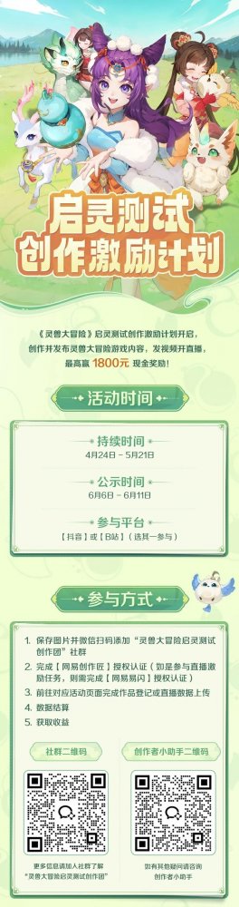 啾啾~亲爱的灵兽师们~ 随着【启灵测试】将于4月24日开启 本鸟又有新活动公布啦! 创作激励活动来袭 不论你是回合制领域的主播大佬 还是热爱《灵兽大冒险》的玩家 只要前往 【网易创作匠】、【网易易闪】 完成认证并报名参与活动 发布或直播 《灵兽大冒险》游戏相关内容 就有机会瓜分现金奖励 ★最高可赢1800元!★ 快点击长图、扫码进入创作者社群 优先享受群内福利! 也可添加长图中创作者小助手二维码 获取更多活动指引~ |