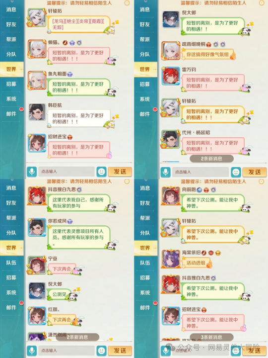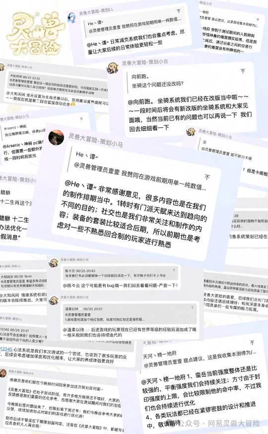 啾啾~各位灵兽师好呀! 自从上周日万灵测试结束后,游戏中少了各位活跃的灵兽师,鸟实在是有些寂寞! 恨不得逮着策划小马明天就开服,好和各位热情的灵兽师们再会!T T 但是面对从灵兽师们那里收集到的500+条宝贵建议,大家都深知时间紧任务重,必须全速对游戏进行调整优化,才能让游戏以更好的样貌和各位灵兽师们见面! 随着策划小马连夜加班熬秃头,鸟也努力对本次测试进行了一波复盘——让我们一起来回忆一下本次万灵测试中的点点滴滴吧! 字字珠玑,感谢陪伴! 在万灵测试期间,鸟收到了来自许多灵兽师的反馈,有真挚的鼓励,也有建议与鞭策;其中还不乏大佬给我们写了共计上万字的建议反馈,鸟看到都惊呆了! 感谢灵兽师们 陪伴我们度过测试的每一天! 收到了来自平台社区的 超多反馈点子! 不论是在社区激情讨论、畅谈想法的灵兽师,还是在私聊窗口激扬文字、狂码上千字意见的灵兽师,各位的真实反馈都是我们优化游戏的重要参考! 热情拷问,坦诚交流! 在万灵测试期间,我们第一次在官方社群内展开了策划面对面,五位策划同学进入社群,与灵兽师们针对游戏优化方向深入交流,听到了许多灵兽师的真实反馈,收获颇丰! 鸟看见策划小马在活动结束后从会议室全速赶回工位,即刻敲起了新的需求文档……燃起来了! 希望后续也能有更多和灵兽师们深入交流的机会! 策划在线接受 灵兽师们的热情拷问! 聚众合影,下次再会! 在测试结束前一个小时,天宫突然热闹了起来?鸟赶往现场一看,竟是灵兽师们齐聚天宫,拍起了大合照!世界频道还有许多灵兽师高强度刷屏,互相告别,畅想未来,氛围超好,鸟鸟感动一万年!T T 能在万灵测试遇见这么多热情的灵兽师,鸟的班味瞬间变淡! 鸟迫不及待想要和灵兽师们在游戏里再会了! 陆续前往天宫 拍集体照的灵兽师们! 整整齐齐一家人! 大家在世界频道互相告别! T T舍不得大家啾啾…… 最后 鸟代表灵兽大冒险开发组 再次感谢各位灵兽师热情参与本次万灵测试 并且给我们提出大量的宝贵意见! 我们会参考大家的意见 努力打磨优化游戏! 相信下次相遇 《灵兽大冒险》能蜕变成 更好玩更有趣的竖版回合制MMO游戏! 那我们下次再见咯!爱你们啾啾~ |