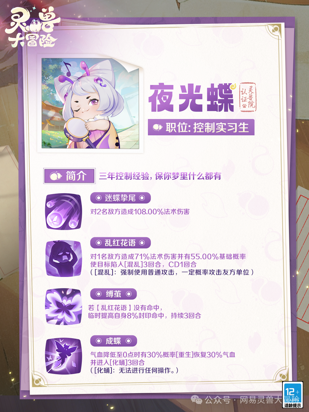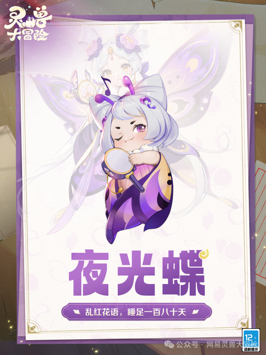 “乱红花语,睡足一百八十天!” 夜光蝶-灵兽简历 夜光蝶-灵兽故事 每当夜幕降临,你若在灯火阑珊时走在长安城的街头,耳畔或许会飘来几声呢喃细语,随后冷不防被袭来的异香熏个喷嚏。待你回过神来,待要迈步,却一脚踏进幻境。这时千万不要慌张,更不要乱动,说不准你就会把川流当成坦途,失足掉进河里。 三界灵兽万千,各有各的逍遥之道。她最爱用幻术和话语让人陷入混乱,再欣赏人在虚实交叠处团团打转的模样——想来只有内心澄明、看破虚妄的灵兽师,才能把她收入囊中吧。 人心本就纷纭复杂,一只柔弱的小蝴蝶,嚼嚼口舌也能让修罗张牙舞爪地内斗起来,又何必再去费尽力气挥舞拳头呢? |