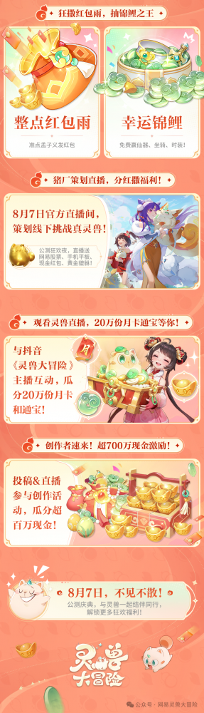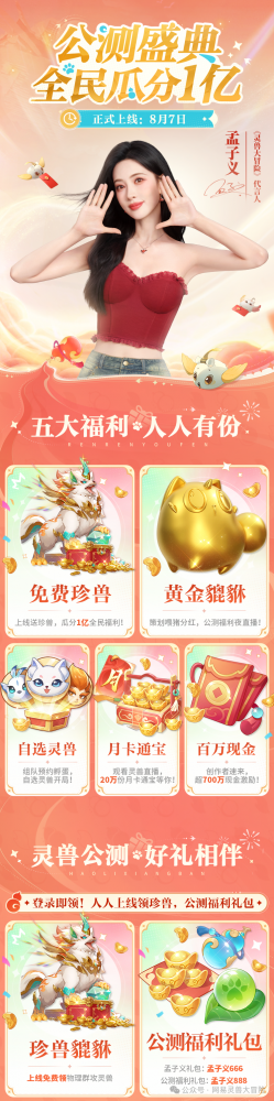 《灵兽大冒险》来公测 本鸟要办两件事! 第一!追星追到孟子义! 第二!所有灵兽师瓜分一个亿! 嗯?你不信? 本鸟马上v你两个“亿” 看看实力—— 代言人孟子义,正式来袭! 啾啾!本打工鸟在此宣布—— 鸟追星成功啦! 《灵兽大冒险》 代言人 孟子义 正式官宣! 孟子义空降《灵兽大冒险》! 这个三界,有点子义思! 同时,官网预约福利超级加码! 快前往官网预约游戏 孟子义喊你捉个灵兽,“义”起冒险! 累计预约量冲到500万 即可全服赠送【伙伴-月灵儿】! 公测盛典,全民瓜分一个亿!! 灵兽大冒险公测在即 开发组狠狠爆金币! 灵兽师们有福了—— 所有人,8月7日公测瓜分一个亿! 上线即领免费珍兽 组队"孵蛋"自选灵兽开局! 游戏内狂撒红包雨 锦鲤之王免费领仙器坐骑! 万元黄金貔貅,网易股票 手机平板,20万份月卡通宝 官方直播间在线免费领! 还有700万 创作者现金激励等你来赢! 还不快点击长图 随本鸟一探究竟? (注:福利总价值包含游戏内对应价值道具) |
