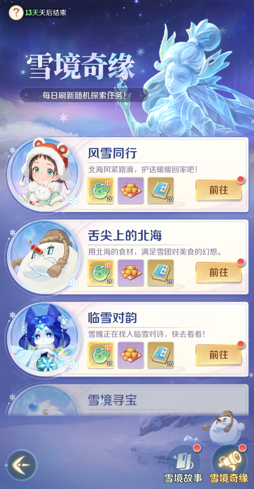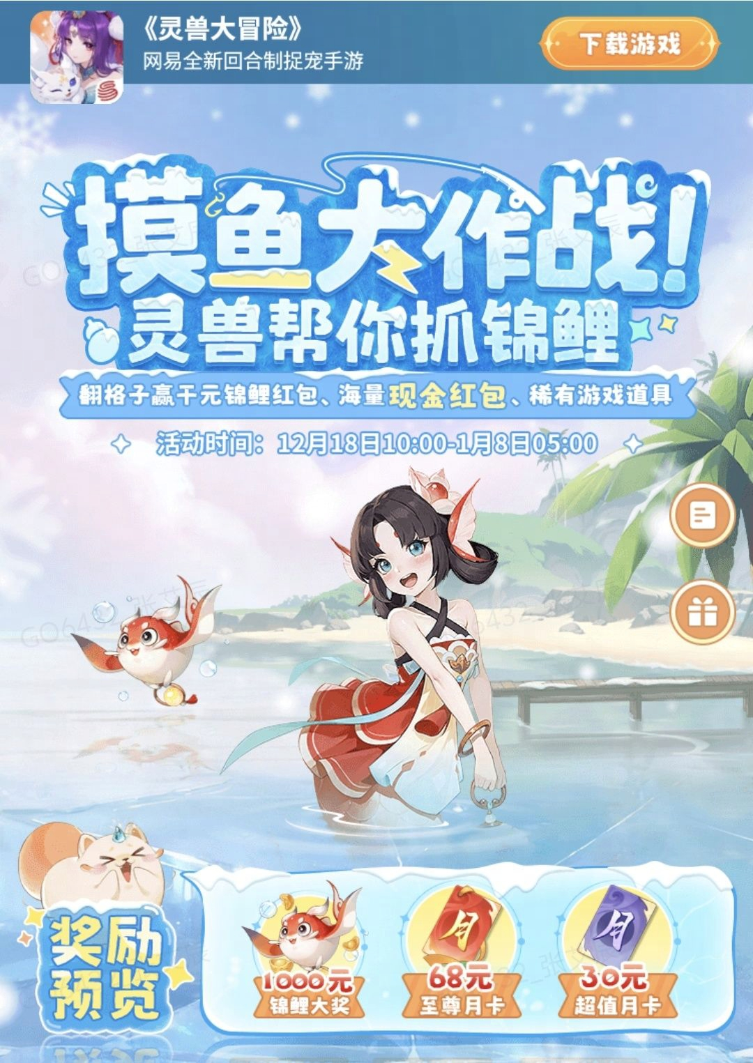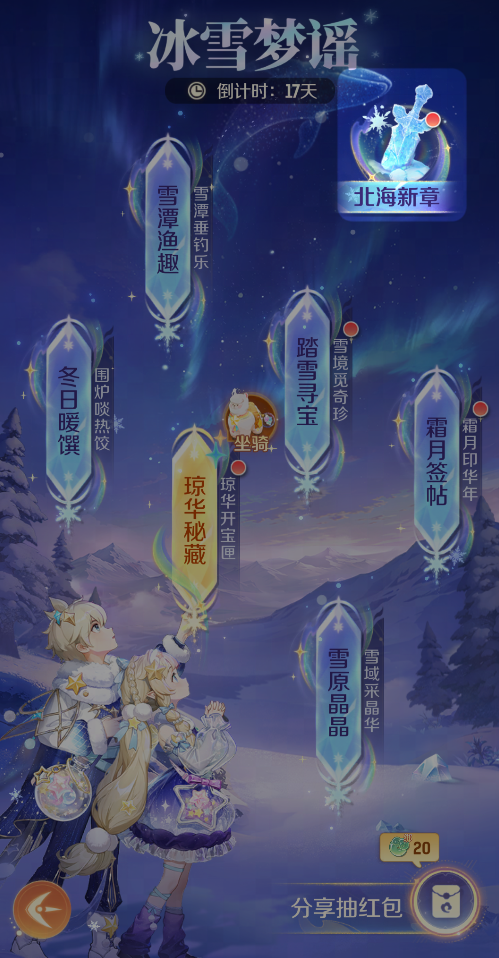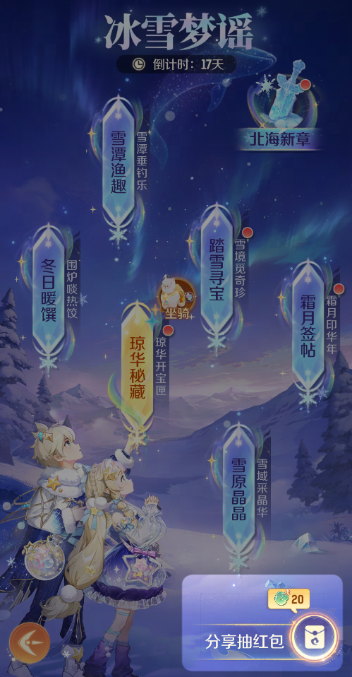 哈啾~灵兽师们好呀! 寒冬将至,灵兽三界也迎来了新的变化 一夜之间风雪满长安 12月18日【冰雪节】新版本即将重磅开启! 全新地图【北海】解封 【冰雪梦谣】活动暖心上线! 策划也将在东北查干湖真·冰钓打工, 直播与灵兽师们线上面对面沟通! 快随本鸟一起裹紧小棉袄,先睹为快啾! 全新时装坐骑登场 极光星语 · 男 碎金短发映星冕,极光流彩绘华服 漫天星斗落肩头,璀璨银河绕身旁 极光星语 · 女 绮梦星裙缀流光,霜雪轻抚少女颜 金丝漫卷扬星屑,踏歌漫舞极昼间 坐骑 ·?羊绵绵 绒绒暖意御寒霜,闪耀星辉颈畔扬 呆萌灵兽踏云至,满载星河入梦乡 全新地图 · 北海 这里,并非寻常意义上的极寒之地。 一夜之间,冰雪越过城墙,覆满长安街巷,那片被封印百年的海域,正顺着命运的裂隙苏醒。百年前,灵兽院院长与神女联手,以补天剑为锁,将修罗恶念与北海一同封存冰下。 如今,封印松动,烛龙残骸躁动不安。唯有被选中的天命之人,方能踏入这片被遗忘的冰封之地。在这里,冰雪之下埋藏着灵兽院遗民的过往,也等待着你去揭开那段未完的故事。 全新玩法&冰雪节系列活动 雪潭渔趣 灵兽师前往新地图北海的专属钓鱼点 即可开启全新冰钓玩法! 这里不仅有全新的珍稀冰钓鱼种等你收集,更有传说中的北海鱼王限时出没!北海鱼王将在特定时段巡游渔场,并带来大量稀有鱼群! 快集结你的钓友,一起征服这片冰蓝水域吧! 北海新章 霜雪已扫径,星辉正引灯 北海新章将启,灵兽师可每日点击活动主界面右上角【北海新章】,解开北海尘封已久的故事与秘闻! 你可以体验在五天内陆续解锁的【雪境故事】,步步深入北海; 还有每日随机刷新、可供探索的【雪境奇缘】,了解北海秘闻! 绑定仙玉、通宝奖励等你拿哦~ 霜月签帖 霜月呈祥,日签纳福 活动期间每日登录游戏 即可逐步解锁各档签到好礼 八荒遗风、高级藏宝图等你拿~ 踏雪寻宝 踏雪寻踪,晶石换礼 完成任务获取活动代币【冰晶石】 可在商店兑换各类珍稀道具 活动道具商店 通过购买商品可逐步解锁,切勿错过! 冬日暖馔 冬日暖心,饺子传情 每日亲手包饺子,寻找专属幸运味道 累计吃饺子 可领高级藏宝图、专属徽章等奖励 每日吃幸运饺子还有额外奖励! 包出高品质饺子 别忘了分享给帮派好友共尝鲜! 雪原晶晶 雪原探矿,挑战守卫 每日在北海地图 限时刷新晶矿守卫与冰晶石 采集冰晶矿或组队挑战守卫 赢取丰厚【冰晶石】 全帮协力收集,次日全员共享分红大奖! 特别企划 · 灵兽策划冰钓打工 12月18日 中午12:00 锁定官方抖音直播间! 看广东策划勇闯北方 挑战零下极寒冰钓! (本鸟很担心他们会被冻成冰雕啾...) 直播期间更有冰雪节时装等超多福利派送 千万不要错过这场“冻”感十足的直播! 冰雪奇缘,邀你共赴! 网易灵兽大冒险 福利活动 · 摸鱼大作战! 灵兽冰雪季,摸鱼大作战! 12月18日 版本更新后 点击【冰雪梦谣】活动主界面 右下角分享按钮 即可前往【摸鱼大作战】活动页面 完成任务,即可翻格子抽取 1000元锦鲤大奖与海量现金红包! 还有海量高级藏宝图、八荒遗风 通宝等好礼等你来拿哦! 12月18日,让我们相约北海,不见不散~ 打工鸟要去买暖宝宝准备看直播了啾~ 灵兽师们记得穿厚点来玩哦! |