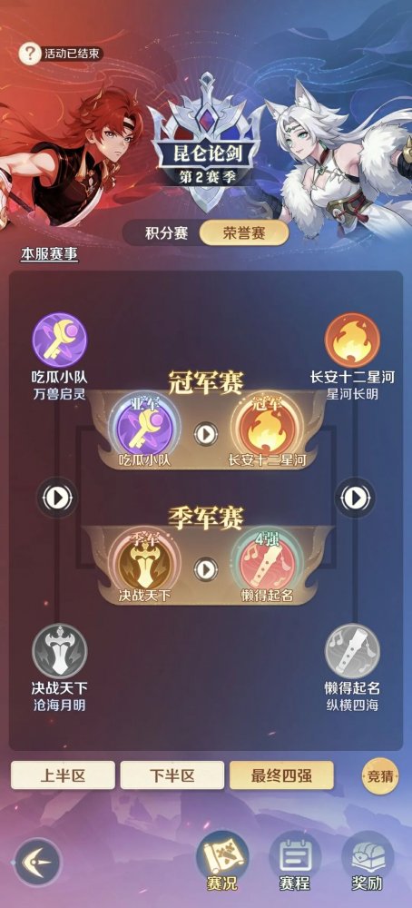 第二届「昆仑论剑」已落下帷幕 让我们一起看看第二届跨服总冠军 究竟花落谁家呢! 第二届「昆仑论剑」冠军战队 区服:星河长明 战队:长安十二星河 队长 「天宫」天河 队员 「方寸」再偷禅试试 「地府」空渊 「蛮岳」森豫 「盘丝」海棠 「方寸」水封 「天宫」星月 恭喜来自【星河长明】的战队 【长安十二星河】 新锋耀昆仑,一剑冠群巅 夺得第二届「昆仑论剑」跨服赛总冠军! |