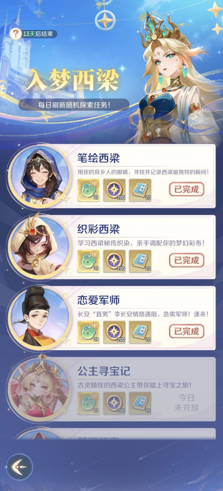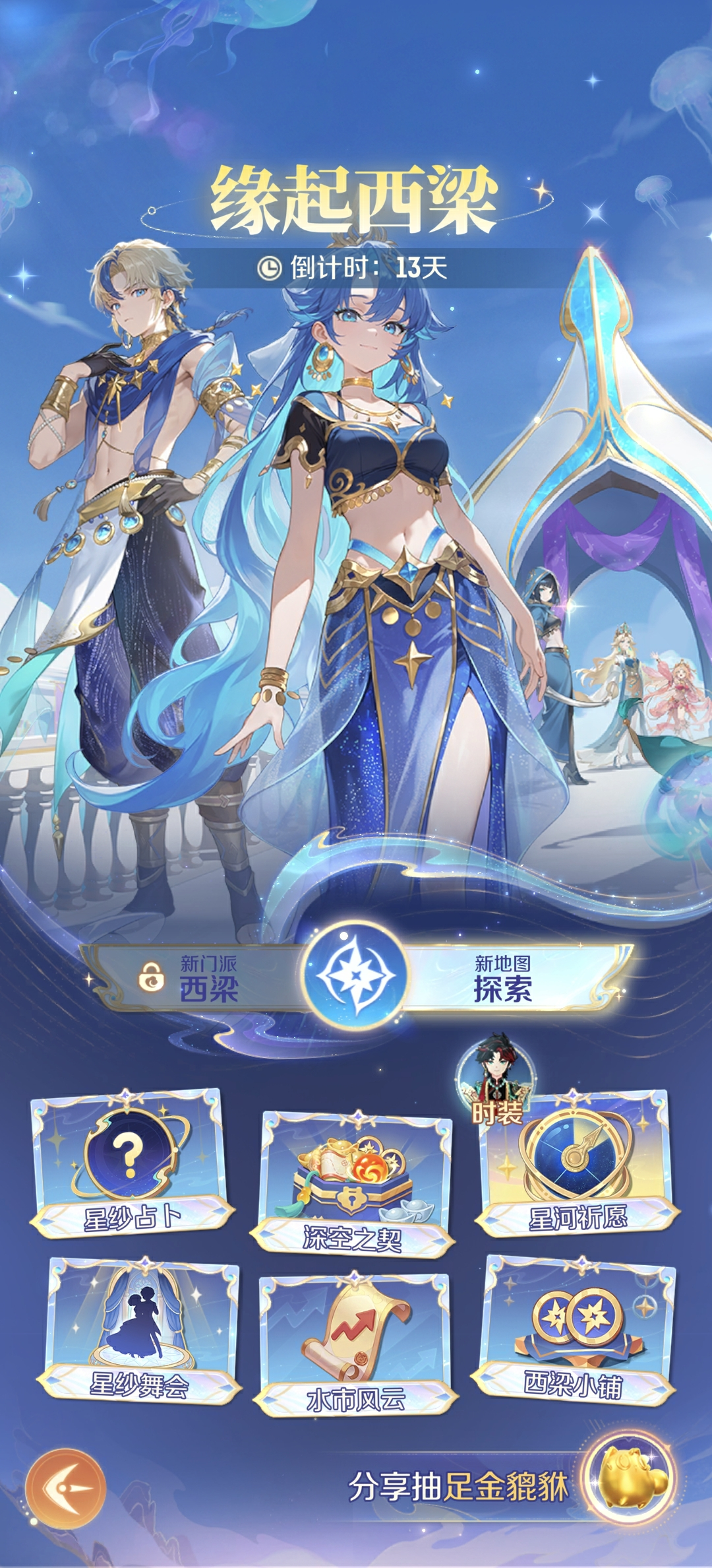 听说西梁有最热闹的水市? 有最动听的音乐 有最会跳舞的舞娘 参加还有机会拿绑定仙玉和称号 我去,不早说! 给你省流鸟 1.星纱舞会:可获得绑定仙玉、通宝、星币,冲击排行榜还有机会获取限定称号 2.水市风云:可获得绑定仙玉、通宝、星币,还有概率获得神兽精魄、八荒遗风等珍贵道具,冲击排行榜还有机会获取限定称号 3.入梦西梁:可获得绑定仙玉、星币等道具 4.西梁小铺:可消耗星币兑换神兽精魄、八荒遗风等珍贵道具 5.预约2月5日【入梦西梁】新服,可在新服获得绑定仙玉、通宝等奖励 玩法介绍 水市风云 大A我唯唯诺诺,水市我重拳出击! 根据市场事件,精准判断走势 稳赢绑定仙玉、通宝等道具! 还有几率通过股神宝箱获取 神兽精魄、八荒遗风! 星纱舞会 你你你,你要跳舞吗? 来西梁女国,舞娘陪你跳! 每日在舞会开启时间内参与舞会 按节奏完成指定舞曲 即可获得丰厚绑定仙玉、通宝奖励! 还有星币助你兑换珍贵道具 注意跟上舞步,不要摔跤啦~ 入梦西梁 在西梁,就要做西梁人该做的事! 每日跟随当地居民指引 完成指定探索任务 在西梁地图拍照打卡 学习西梁文化 即可获取绑定仙玉、星币等奖励哦! 西梁小铺 在西梁小铺消耗星币 即可兑换神兽精魄、八荒遗风 高级藏宝图、高级兽决 等海量珍贵道具! |