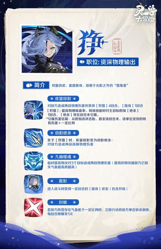 啾啾!打工鸟速报!! 除夕将至,瑞雪惊变 据说城西有神兽现世! 各位灵兽师们速速前往 一同探寻全新神兽——「狰」! 暮色将息时,城西巷尾常有影子厮斗。 你只需快一步——赶在黑爪落下前,掷出那块滚着椒香的太湖银鱼干,自然会有只小豹自墙头跃下,尾巴绷得像柄出鞘的短刀,却偏偏先低头,利落地叼走鱼干。 千万别当她只是只贪嘴的豹妖。她是神兽“狰”——光影边缘的猎手,身披夜色而来。 她爪尖沾着修罗血,脊骨里烙着灵兽院的暗印。 修罗营帐中,她只需低眸抬眼,便能将“嗔痴恨”三将的心思洞穿;灵兽院内,她以血肉为饵,诱出的叛徒至死都以为这是一场搜魂的酷刑。她演得出孤傲,咽得下疑心,甚至敢邀你共演一场双面戏码——扮修罗尊者,破内奸迷局,将计就计时反手掀翻整盘杀棋。即便轰塌修罗巢穴、碎尽奸佞算计,她也只是抖落一身电弧,转身步入更深的幽影。 她不需要归宿,因为雷霆本就不会为谁停留;若你于绝境中见紫电裂空、听惊雷独啸——那便是她正行过此夜,以孤高为刃,狩尽人间鬼蜮。 ——独行雷霆,猎影无形。 狰·幼年期 狰·成熟期 狰·化形期 基础定位:物理输出 进阶定位:物理收割,利用隐身、生命汲取能力游走于刀尖之上 主动技能 -疾雷掠影- 对敌方造成两段物理伤害并获得【狩猎】4回合、【隐身】1回合。 *【狩猎】:提高物理吸血率、释放技能时对主目标附加【绝杀】1回合,【绝杀】将在回合末引爆。 *引爆伤害结算:从附加该状态始,直至该回合末,该单位受到的所有伤害×一定比例。 -劫影绝杀- 处于【狩猎】时,疾雷掠影变为劫影绝杀:对敌方造成两段高额物理伤害。 技能+绝杀特效展示: -九幽噬魂- 临时提高物攻对3个目标造成两段物理伤害(提高的物攻随敌方已损失气血提高而提高)。 技能特效展示: 被动技能 -匿影- 进入战斗时获得一定回合的【隐身】状态(包含开局)。 -封喉- 若敌方阵营存在气血低于一定比例时,立即行动将敌方单位斩杀倒地,每回合限触发1次。 全新神兽「狰」 2月12日更新后正式上线! 灵兽师们快来与她结缘吧~ 更多新春版本爆料 本鸟明天将持续更新啾! |