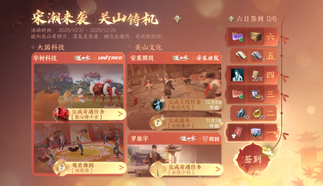 各位自在同门:《逆水寒》手游将迎来3.2.1版本更新,将有大量更新内容和海量福利。为保证服务质量和服务器的稳定运行,《逆水寒》手游将于2025年10月31日早4:55停机进行维护工作,预计维护到上午10:00。维护结束后,登录游戏可在主界面领取更新奖励:1000绑玉和精美配饰【泡影洄游】(每个账号仅可领取一次)。 【瀚海夺珍】 万里瀚海,汇纳奇珍——全新搜打撤玩法【瀚海夺珍】将于10月31日当天开启。同门可以通过主界面的独立入口进入,或是通过呼吸界面内-新内容-瀚海夺珍页跳转。 这是一个以“搜索、战斗、撤离”为核心体验的全新玩法!以带出更高价值的物资为整局的追求目标,不断填充仓库变强。 该玩法为公平玩法,仅有流派默认特质和部分武蕴生效,无需进行复杂的前置养成,上手即玩! 【惊喜的摸金体验】玩法地图中遍布着各类宝箱,可从中开出白/绿/蓝/紫/橙/彩多种品质的珍宝,其中橙色与彩色品质的珍宝非常稀有,一旦获得可以卖出极高的价格。除了珍宝以外,宝箱中还藏有着玩法特有的独珍装备与稀世武学等你来拿! 【丰富的游玩方式】玩法以“安全撤离”为目标,战斗只是一种游玩方式。地图里驻守或游荡着各类小怪和首领,击败这些敌方怪物也可以获得丰厚的物资奖励,更有隐秘的山洞和随机事件供玩家探险。一旦获取到满意的物资,地图里存在着多种多样的撤离点,就近选择合适的撤离点,即可满载而归! 【轻松的上手学习】提供新手教学关卡、一键配装的装备纹章、还有可以不断升级的“偃工匣”(安全箱)使用。一旦不小心撤离失败,好友雨莫晴也会持续为你提供装备支援…… 参与【瀚海夺珍】,您将可以逐步获取【时装:韵雪玉兰】,PVP独珍装备【探海·奇衍千策带】、【截火·流炎飞霞袍】,以及稀有内功、交子等养成材料;还可以使用玩法中获得的货币兑换【配饰:福宝驾到】、【配饰:澜心之泪】等丰富的外观奖励;更有几率在玩法中直接获取【白夜拂雪】和可交易的稀有物品【流泽寒晶】【砺荒炎石】【银河星纱】【琼华白羽】。 【新场景关山】 纵马越重关,砺刃角声里。朔风过寒水,藏剑本无锋。昔日重城,草衰杨枯。然草木枯荣,日升日落,重振此城,只待时至。 待君策马扬鞭,前往关山,寻觅心中之剑。 前往【关山】,体验全新探索机制,畅享海量内容,更可获得【逍遥·凭虚御风靴】、特质【破云撼罡】以及诸多独珍装备、江湖特质、惊喜外观等丰厚奖励。 【关山正传·戎马关山北·上篇】 关山万里,故约遥赴河浒。黄滔卷恨,谁怜兵戈里,生众同苦? 叹五载风烟,无锋空对,断碑残骨。 一朝昆吾待耀 ,岂料人心难睹?寸锋寸险入罗局,莫问前劫几度! 10月31日版本更新后,开放关山正传《戎马关山北·上篇》。 完成任务可获得独珍装备【阮风临·百草聆风囊】、外观配饰【有骨气】、工艺配方【关岭香佩】、歌曲【边城谣】等丰富奖励。 【关山藏锋】 全新12人武侠团本【关山藏锋】等你来探! 11月7日9:00【关山藏锋·山外】将会开放,11月21日9:00【关山藏锋·山内】开放前两名首领,随着剧情推进,最终首领将在11月28日开放! 【关山藏锋】团本进入等级要求为89级,满足等级要求的同门可组成12人团队打开副本界面前往。 参与【关山藏锋】,可获得全新独珍装备、147-149装等的百炼装备;更有机会掉落大量外观,包括【发型:天墟垂雪】、【时装:霜天悬刃】、【时装:剑魄镜影】;【宠物:典·猎影】;【庄园组件:熔火·铸造台】;【配饰:玄渊虬角】、【配饰:炽牙尘氅】、【配饰:狂嗔烬刃】、【配饰:霜玉剑魂】、【配饰:缚目素绡】;【木桩:桩·野利白妙】等,还有缚龙签、新版本内功、内功宝箱、新打造材料、砺荒炎石和流泽寒晶等! 【武林风云录·侠影丹心】 武林风云录系列再添新副本,【侠影丹心】普通难度即将开放: 11月1日5:00,【侠影丹心】将会开放,等级达到82级的同门可挑战前两位首领:聂隐娘、空空儿。11月3日5:00,可挑战后两位首领:红线、荆轲。 满足等级要求的同门可组成6人队伍打开副本界面前往,亦可单人模式参与。 挑战【侠影丹心】副本,可能掉落全新独珍装备、147装等的百炼装备,更有机会掉落外观【时装:易水藏锋(男)】、【时装:墨月归鸿(女)】、【配饰:千幻诡面】、【配饰:戏刃缠影】、【配饰:幽纱缚金】、【配饰:燕途秘卷】,木桩外观【桩·红线】,内功等。 【燃心画境·业火】 蛊铃声远,梵钟骤鸣,【燃心画境】全新篇章【燃心画境·业火】正式开放: 1、等级达到81级的同门可通过副本界面直接参与,首期开放难度1-9。 2、【剧情关卡】: 开放全新剧情关卡,竺心执掌画境,面对其设下的重重挑战,同门唯有一路击破拜火教首领,方能最终直面伽萨…… 3、【小队挑战】: 新增多个情境与首领关卡,画境之下,重现药王谷之变、流珠祭海仪式等经典场面,挑战贝野、沙影狂狮、旧日竺心等全新首领。 4、【团队挑战】: 更新维护后轮换为【墨先生】&【心焰·那灼罗】,【心焰·那灼罗】为首个画境专属团队首领。 5、【浴火淬心】: 更新后浴火淬心将有全新的样式,并与心火等级共同迎来重置。每个流派将新增约20个全新的技能心悟。 6、【玩法奖励】: 参与玩法,可获得全新独珍材料,百炼装备,首领秘藏,新版本优质内功,更有机会掉落大量外观奖励!领取全部奖励所需积分下调,每周积分宝箱、活力额外宝箱所需积分