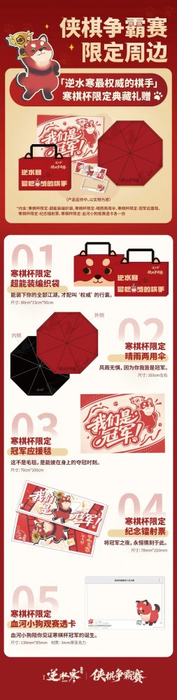 各位逆水侠棋弈手注意!瓜分60.8万现金+179.2万纹玉的机会来了! 逆水侠棋专属全民赛事 【侠棋争霸赛】(以下简称“寒棋杯”)?今日开幕!这是一项为逆水侠棋爱好者准备的全新舞台,您将与全服棋手同台竞技,争夺丰厚现金奖励与专属赛事奖励! 如果您渴望高质量的侠棋竞技对局,开启智斗巅峰;如果您想要向全服务器证明棋技,将名字留在逆水侠棋的江湖;以及,如果您想靠逆水侠棋来“把钱挣了”……那欢迎您参与“寒棋杯”!寒棋杯主打一个“超低门槛、纯粹竞技、奖励丰富”。 超低门槛:逆水侠棋段位达到“传说”即可报名参与! 纯粹竞技:第一赛段【海选赛】采用巅峰赛专属匹配机制,与正常排位隔离,并且全程匿名、无法组队! 奖励丰富:无论您是亲自参赛还是观赛应援,都有奖励!包括“全新坐骑”“专属荣誉性外观”“专属头衔、称号”,若您打入后续赛段,还可拿到高额纹玉与现金奖励,奖池共计60.8万现金+179.2万纹玉! 寒棋杯第一赛段【海选赛】即将开启,11月12日-11月16日每天18:00-24:00,您可通过侠棋主界面参与海选赛。只要参赛就有奖,参与海选赛可获得更多的风云令、星梦券、扬威点,每日前3局还可获得交子与内功奖励!如果您还未到达“传说”也无需担心,海选赛期间到达传说段位也可立即参与! 点击游戏内右上角“寒棋杯” 可报名参与比赛并查看具体赛事奖励和赛事流程 每名玩家都将拥有1000的初始积分,根据每局排名获得或扣除相应积分。11月16日最后一天海选赛结束后,排名前256位玩家将晋级【小组赛】赛段。更多详细规则您可参考游戏内说明或者观看文末的规则讲解视频。 如此热血的全民赛事,自然要配上盛大的舞台!最终决赛,将在坐落于上海市青浦区的长三角国际电竞文化中心进行线下巅峰对决,全服高手共聚一堂争夺冠军荣耀! 作为逆水侠棋首届全民性官方赛事,“寒棋杯”赛事组也投入了大量的人力物力财力进行筹划。除了专业的现场观赛体验外,场地也焕然一新,充满着浓厚的逆水寒氛围,沉浸感拉满! 不仅有热血而专业的赛事,“寒棋杯”还将是一场欢乐无穷的线下盛会:现场还将有8位神秘嘉宾降临,为大家带来乐趣不断的精彩表演赛,与大家一同品鉴逆水侠棋的魅力!此外,最最最好的逆水寒8大侠缘也将穿越次元壁,陪您一同观看比赛,共同见证冠军的诞生! 当然,福利也不能忘了!来到现场观赛的观众都能获得我们精心准备的限定周边:「逆水寒最权威的棋手」 寒棋杯限定典藏礼赠!现场还设有丰富的打卡互动活动,还能领走更多精美福利! 如果您想参与线下观赛,请关注以下信息: 主题:逆水寒侠棋争霸赛-线下总决赛 时间:2025年12月14日 地点:上海市青浦区长三角国际电竞文化中心 参赛选手:淘汰赛八强(两个赛区,共计16人) 观赛规模:500人 观赛报名:免费参与,后续开放问卷报名 新坐骑免费拿! 逆水侠棋专属战令今日开启 作为一场全民性赛事,寒棋杯不仅要让大家玩的爽,看的爽也安排到位!如果您想欣赏高质量侠棋对局,观看全服高手巅峰对决,亦或是学习侠棋技巧,可期待后续的观赛与应援! 11月22日小组赛开启,官方直播间将同步开启直播,为您精选高质量战况对局!同时,应援战令也于今日(11月10日)上线,完成简单任务即可收获丰厚的奖励,包括侠棋专属外观【攻击特效·驭雷·一阶】、打造材料、染色材料、绝技等诸多好礼! 应援战令的任务也主打一个“殊途同归”,包括下棋、打本、探索、竞技、闲趣等等。只要您正常游玩,都能够轻松升至满级! 同时还有超多应援币,用来兑换全新坐骑【蹄音·乌霜】、自选紫色打造、染色材料、优质内功等诸多好礼!温馨提醒:只要将战令升至满级,即便不参与一场应援,也可以免费拿下最重磅的新坐骑和紫色打造,还有富余! 应援战令分为免费基础奖励与进阶奖励,您可花费【68元】来解锁进阶奖励,可收获全新棋盘【炽浪铸胜】、侠棋专属外观【攻击特效·驭雷·二阶】,还有铜钱、妆容、烫画、鉴石神凿(2个可交易,1个绑定)、更多竞猜币等。 应援战令与寒棋杯“海选赛”报名已于今日开启,欢迎大家进入游戏内查看。小寒带大家回顾一下寒棋杯的整体赛程与赛制: 更健康、更有趣 逆水侠棋平衡性调整预告 逆水侠棋第二赛季近期上线了多项平衡性调整与设计简化。为了营造更健康的竞技环境,为大家带来更多元的博弈性乐趣,开发组也将重点持续关注平衡性。预计今天晚上将实装新一轮平衡性调整: 2025.11.10逆水侠棋 平衡性调整与设计简化 本次调整将重点简化【兰心客】与【辅阵】羁绊在对局中的理解与操作成本:兰心客的休假券将不会再减少棋子的属性加成,并在使用的当回合就能获得收益,同门可以自由无负担地使用休假券啦;辅阵也大大简化了获得属性加成的机制,但也同时保留了其作为辅助其它C位棋子的能力。 此外,大寨主【楚相玉】的伤害让脆皮的输出棋子生存压力太大了,也限制了职业羁绊阵容的发挥,他的远距离输出能力应得到一定控制。 1、棋子调整 【陆离】定位调整:强攻射手→迅捷射手(基础属性将对应改变);内力锁延长:0.2秒→4秒,内力上限降低:60→40,召唤的玄叽伤害提高:140%→220%,并继承陆离攻速 【叶构】额外剑气伤害提高:300%→400% 【祝由】内力上限降低:55→45 【波波桃】提前爆炸的承伤气血降低:50%气血→25%气血 【长笑】技能伤害提高:600%→800%,内力上限降低:3