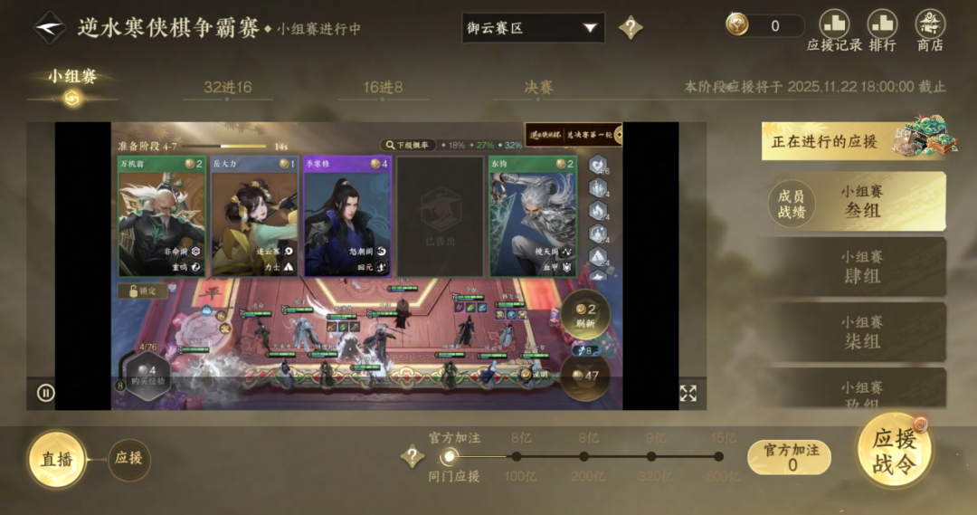 2026年倒计时45天!首先恭喜大家即将平稳度过2025年,并且成功跨越21世纪的前四分之一! 开发组也正在紧锣密鼓地筹备“SSS级”重磅的【跨年版本】,包括极为盛大的跨年庆典与非常丰富的内容更新!希望奉上至臻完美的沉浸式体验,与大家共同奔赴更加精彩的2026。 而在【跨年版本】前,大家还将迎来逆水寒史上最浓缩、最紧凑的新版本——20天内,您将体验到一系列高品质的更新内容与爽快上头的游戏体验!而在连爽20天后,直接无缝衔接到超重磅的【跨年版本】!下面请看3.2.2版本概念性前瞻: *以下素材皆为开发中效果演示,上线版本更精美更细腻 以上内容仅为3.2.2版本的“概念性前瞻”,即精选了部分重要内容进行提前展示。更多新内容的正式介绍与【跨年庆典】的爆料,敬请期待小寒后续预告! 戎马关山,宿命相逢。12月5日,逆水寒诚邀您赴约。 逆水侠棋专属全民赛事 【侠棋争霸赛】?(简称“寒棋杯”)海选赛现已结束。经过5天的角逐,全服最强的256位弈手即将携手迈入小组赛,朝着总冠军继续进发! 而在11月22日(周六)小组赛正式开打,同时将开启全程直播,精选高质量对局为您直播精彩战况!游戏内点击右上角“寒棋杯”→赛事应援,即可观看直播! 此外,还有非常有趣的应援活动已于今日开启:是否有选手能合成三星五费?是否有选手能连续三局获得第一?是否有选手能达成冥渊羁绊9999层天神道?……为本就高质量的对局,增添更多精彩的节目效果! 参与赛事应援,可获得更多应援币,兑换一系列精彩好礼!包括全新坐骑、【自选】紫色打造、优质内功、染色材料等。 更详细信息,可关注此前推文或者游戏内详细介绍 小寒为您带来了后续赛事阶段的直播日历,想要看到精彩对局的同门不要错过! 此外,小寒关注到部分参赛选手对比赛版本、线下赛制存在疑问,在此为大家作出说明: 1、12月5日3.2.2更新后的比赛版本特殊说明: 为保证赛事版本的稳定性与参赛选手策略延续性,12月5日3.2.2版本更新后的比赛(包含两场16进8淘汰赛,以及线下总决赛),将仍使用《逆水寒》手游 3.2.1末期版本。比赛使用游戏包体为3.2.2版本,但赛事中不会出现3.2.2新增内容,如新增心悟、羁绊效果等不会在赛事版本中出现,赛事仍以3.2.2版本更新前的状态进行。 2、线下决赛顺延规则说明: 本届赛事线下总决赛将于12月14日在上海青浦区长三角国际电竞文化中心举行,参赛选手为两大赛区排名前八的选手。为保证赛事公平性以及考虑到突发状况,若获邀选手无法出席,其参赛资格将按以下规则处理: 1、参赛资格将严格根据淘汰赛成绩,由下一顺位选手进行递补。 2、为维护赛事公平,弃赛选手与其递补选手的最终名次将予以互换。 例如:若原第八名选手弃赛,则由第九名选手递补参赛,且两人的最终名次将互换(即递补者列为第八名,原第八名则调整为第九名) 后续,小寒将为大家带来线下总决赛观赛指南与报名方式介绍,包括神秘嘉宾与限定活动,敬请期待! |