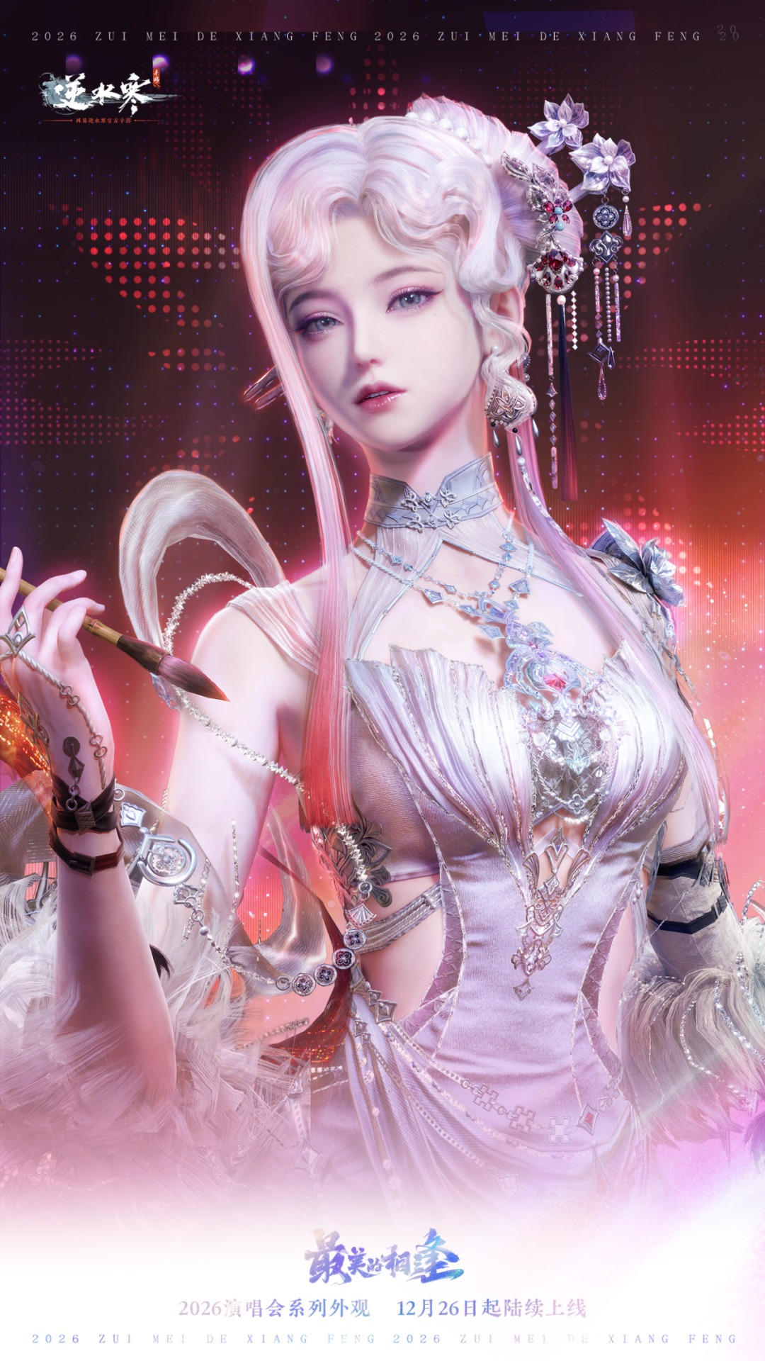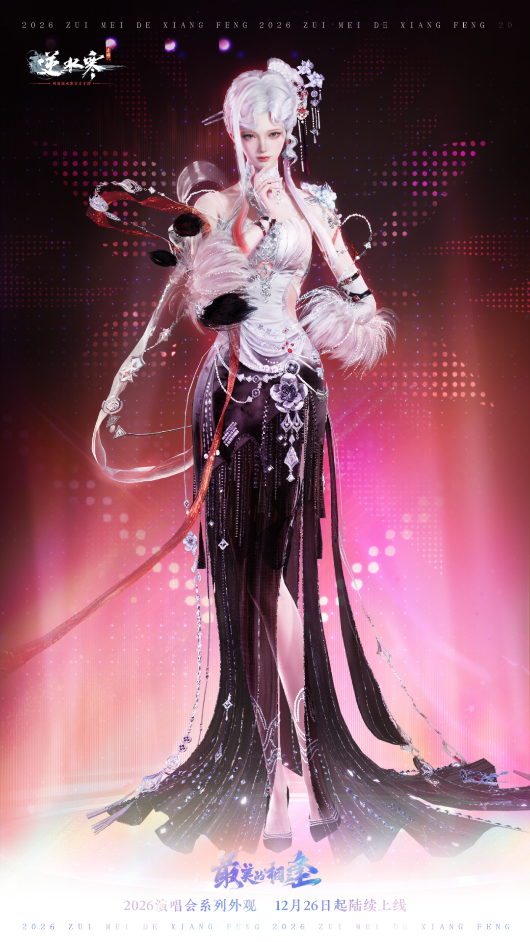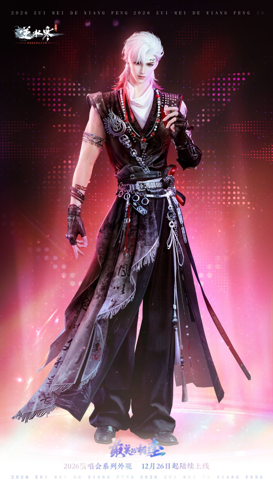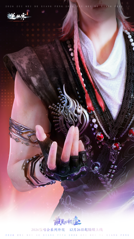 新国潮出道“战袍”之主舞系列,即将正式上架—— 女款时装采用极具风格的及地长裙设计,尽显优雅气质。中式水墨渐变配色意境悠远,让时装贵气典雅。加以恰到好处的宝石点缀,更添一抹灵动闪耀。 男款时装以充满野性张力的配饰重塑常规廓形。银饰与皮革腰带束出挺拔身姿,银质臂环雕琢手臂线条,璀璨的宝石项链则成为整身造型的点睛之笔。 男女时装均有两款裁剪款式!男款时装可去掉腰部装饰,或去掉腰部装饰及手套;女款时装可去掉手套,或选择短裙款式并去掉手套。更多款式,更多选择! 天阙霓裳卷星河,瑶台仙步落琼芳。1月8日(星期四)至2月6日零点,逆水寒演唱会主题时装【龙阙惊鸿】将限时上架商城,直售价【2880纹玉】,可使用限定纹玉、代金券、半价券。获取时装后,各位同门还将同步解锁配饰墨镜【灼华】、配饰扇子【墨曜天华】、黑发头像、单人动作、双人动作以及群龙之首动画。 1月8日(星期四)至2月6日零点,时装【龙阙惊鸿】专属天赏发型【赤练霜/冰玉绡】也将限时上线神石鉴华商城,各位同门可使用1枚天赏石进行兑换。获取天赏发型后,还将同步解锁稀有发色专属头像【赤练霜/冰玉绡】。 1月8日,穿上新时装,来逆水寒,炸翻全场吧! |