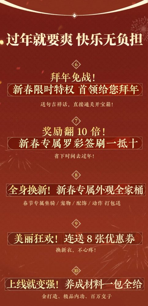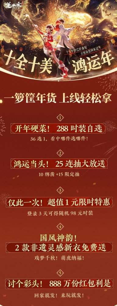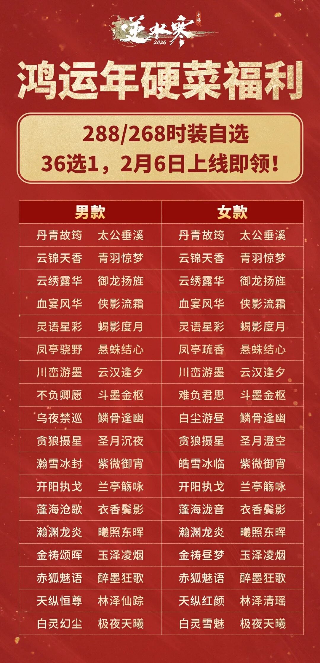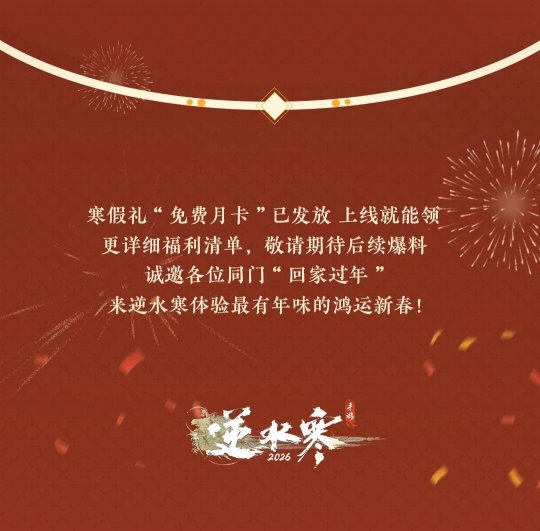 逆水寒“寒假礼”持续发放中,现在上线,即可领取免费月卡! 而免费月卡仅仅是逆水寒鸿运年的开胃前菜,真正的硬菜来了!2026年春节,逆水寒想为您找回久违的“理想年味”!?十大福利年货已备齐,只待各位同门回家入席,共赴这场人间惊鸿! 过年,当然要“上硬菜”!审美自由,才是给您最好的新衣。 开年硬菜:288时装自选!从【血宴风华】的凛冽优雅,到【云绣露华】的雍容华贵……36道顶配直售时装“硬菜”,任您挑选。我们将“审美的选择权”完全交还给您。 穿上它,您就是大宋街头最亮眼的风景。详细清单请见文末~ 过年,当然要“迎鸿运”!马年将至,鸿运必须讲究个“马上就有”! 您将共计获得25连抽:鉴石神凿·绑(10个)+限定外观活动15抽!25份满载鸿运的“签礼”,助您在2026年势如破竹,马上有钱,马上出货! 福利要狠、心意要真,更要送给对的人!每一份福利,都要稳稳地送到同门手上,我们将同步开启专项守护计划,部署严密的风控防火墙,严厉打击脚本与工作室,确保这笔带着满载鸿运的“真金白银”福利,能实打实地温暖每一位真实的大宋同门! 过年,当然要“品国风”!把千年文化瑰宝,穿在身上! 2款以传统非遗为灵感的新衣,将免费赠予每一位守护传统文化的同门。 从这两身艺术瑰宝中,您将亲身感受传承千年的绝代风华。在逆水寒过年,过的就是这份独属于中国人的文化自信。 过年,当然要“爽爽玩”!天大地大同门最大,这个江湖爽字当头! 在现实里忙碌了一整年,各位同门辛苦了!来逆水寒过年,请您卸下疲惫,享受快乐满格无负担的纯粹快意江湖! 【首领拜年】赛季团本最终首领【阮归真】,将放下手中的兵刃,给您拜年并奉上通关宝箱! 【十倍大爆】“罗彩签刷一抵十”新春专属活动,祝大家都能爽爽出货! 过年,当然要“迎彩头”!心意虽轻,情义千金 过年图什么?图的就是一个吉利!?逆水寒准备了888万份红包利是,给各位同门拜年啦!?金额是彩头,心意是承诺。我们希望每一位同门,都能在点开红包的那一刻,收到来自江湖最真挚的祝福:岁岁常相见,年年共鸿运。(防刷守护计划也将持续监测、打击工作室与脚本,确保888万份“彩头”心意都能送到同门手上) 此外,还有8张优惠券、新春专属外观全家桶、金打造等众多丰富扎实的福利年货等您回家领取!更有一位超级火热的逆水寒绝对顶流,送上喜庆欢乐的“特殊新年礼物”! 马上鸿运来,同在逆水寒。上硬菜、迎鸿运、品国风、爽爽玩、迎彩头……今天公布的十大年货福利,正是逆水寒“鸿运年”的一环。诚邀各位同门今年“回家过年”,在逆水寒体验最具年味的新春庆典! 马上鸿运来 新服【大展鸿图】预约开启 新年新气象,想给自己的江湖生涯换个“新活法”?2月6日新春版本,逆水寒将开启2026鸿运年主题服务器【大展鸿图】。 【纯粹公平】:万象更新,所有人从零出发,这是年度最公平的入场券。大家都在同一起跑线上并肩启程,重寻那份最公平、最纯粹的开荒快乐。 【厚礼盈门】:除了上述福利,还可额外领取新服专属500纹玉代金券+500绑玉+5枚玉华染(预约并登陆新服即可领取)!这笔“开山贺礼”,是我们对您重新出发的致敬。 各位同门可点击下方小程序预约2026鸿运年主题服务器【大展鸿图】! 春节新服抢先预约 小程序 如果您是初入江湖的萌新,这里有最包容的起点; 如果您是渴望重燃热血的老将,这里有最辽阔的天地。?所有江湖偶遇,皆是宿命相逢。 有人说,年味淡了。 但在逆水寒,千灯如昼,汴京繁华依旧。?这里有盛大的庆典,有传统的习俗,有扎实的福利,更有千千万万个和您一样热爱这个江湖的同门。 马上鸿运来,同在逆水寒。?这不仅是一句口号,更是我们对2026年的共同期许。 更详细的福利清单与领取指南、超有年味的春节庆典、超欢乐的版本更新内容,敬请期待小寒后续爆料!?这个年,咱们回家过! 具体288/268自选清单如下,大家想好2月6日上线领哪一款了吗! |