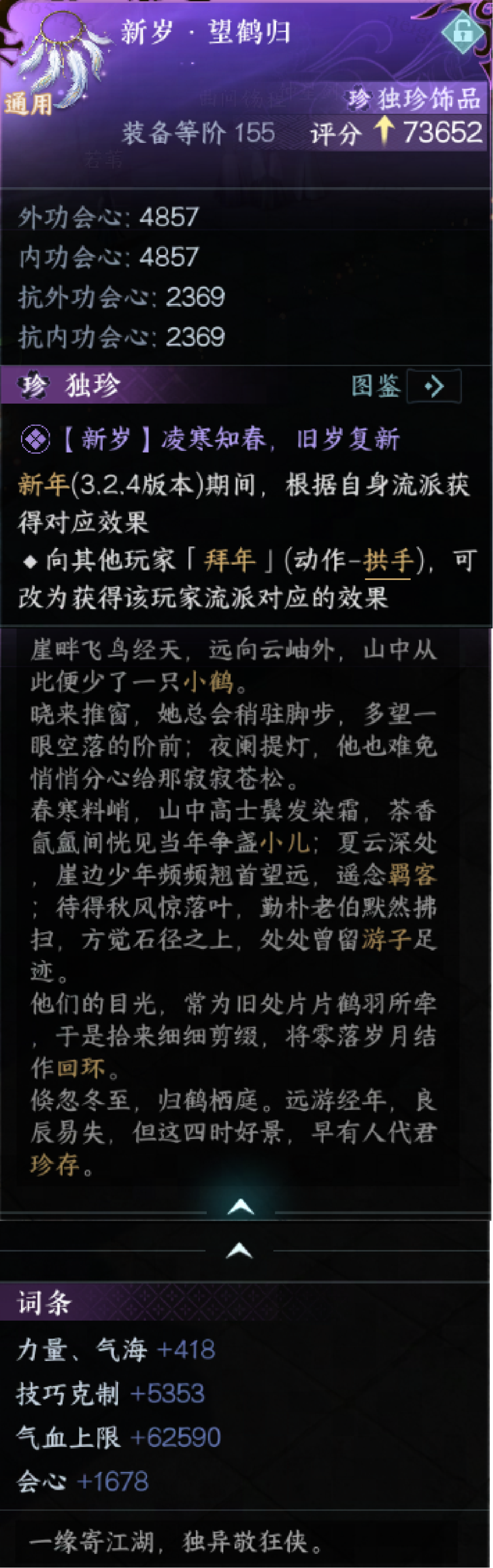 这种久违的“无负担爽感”,逆水寒在这个春节帮您找回来!本周五(2月6日)即将开启的【鸿运年】新春版本,瀚海夺珍将正式进入“必爽模式”:满载而归的爽吃,毫秒之间的爽撤;而竞技玩法也将全面“丝滑化”,副流派限制解除,多项优化生效!除此之外,AI队友也迎来了再进化,一起来看看属于TA们的成长吧! 小寒温馨提醒:2月6日,逆水寒鸿运年版本3.2.4正式更新,海量年货福利已备好! 瀚海寻金 满载而归 【瀚海夺珍】新春活动开启 爽吃、爽撤、爽玩! 新春脚步渐进,【瀚海夺珍】内也年味渐浓!想来一场轻松写意的摸金之旅,再把把赚得盆满钵满?来【瀚海夺珍】新春活动就对了!收益加码、撤离减负、体验升级,全方位调优主打一个爽! 【爽吃】炸年兽 赢红包! 说起春节的故事,怎能少了年兽的传说?2月10日至2月23日,【阖家欢】新春活动限时开启!传说中的年兽【祟】将在此期间入侵刺桐港与苏吉丹岛,击败它即可获取稀有道具【驱秽爆竹】与【封金礼】。 众所周知,年兽最惧爆竹。使用【驱秽爆竹】不仅能对年兽造成巨额伤害,燃放后更可立即开启附近的所有宝箱!而【封金礼】则暗藏惊喜,成功撤离时有概率转化为闪光品质,开启后即可获得各类高价值物资! 【爽撤】锦囊在手 说走就走! 为了解决各位同门“包放满了,却在撤离路上人财两空”的烦恼,小寒特地准备了马年专属锦囊! 活动期间,触发锦囊即可激活坐骑撤离点,实现无门槛立即撤离。哪怕身怀重宝也能全身而退,深藏功与名。希望锦囊能助同门们在春节期间赚得盆满钵满,安心撤离、畅快过年! 【爽玩】多重减负 摸金无忧! 为了给各位同门带来更优质的体验,新版本中您将体验到这些优化与更新: 1.减负优化 仓库和备战阶段新增了【秘钥锁链】栏位,放入其中的钥匙会自动分类,且不会因角色死亡而掉落。从此告别“送快递”的烦恼,钥匙安全有保障! 不用逞强了,因为您的“强”来了!【凡境】难度的刺桐港新增了“侠缘援救”机制,在玩家濒死时有概率获得援救,能够恢复生命并传送至其他安全地点! 2.战斗体验优化 切换流派后也能自由调整武蕴了,战术搭配将不再受限! 3.功能更新 想看队友是否能力挽狂澜,拿下残局?新增的【观战】功能会让您在濒死状态下自动切换至队友视角,在观战时既能静候队友救援,也可以选择退出本场战局。 最后,小寒最近收到了一些同门关于“瀚海夺珍恶意组队”的反馈,再次声明:逆水寒将持续维护公平的竞技环境,严厉打击非法组队及卡BUG行为,现已处罚一批存在恶意行为的玩家(违规名单详见文末)。也欢迎大家多多举报,共同守护纯净的【瀚海夺珍】! 竞技爽战 自在开打 公平论武、试剑天下等多个竞技玩法优化 小寒先掏出“秘密武器”给大伙儿拜个早年!只要完成全新心境任务【天下人间共此春·午马】,即可入手独珍饰品【新岁·望鹤归】,获得具有自身流派特色的强力属性效果! 戴上它给其他流派拜年,不仅能切换对应流派的属性效果,交互时还暗藏玄机——针对被拜年的同门流派不同,会自动触发不同的专属祝福语彩蛋!?让您的拜年既有心意又有新意,助您新春战力“强上加强”! (上下滑动查看更多) 【碎梦】:攻击首领时,会心率提高 【玄机】:攻击首领时,获得命中 【神相】:攻击首领时,获得元素攻击 【龙吟】:攻击首领时,获得忽视防御 【九灵】:攻击首领时,获得会心伤害 【鸿音】:攻击首领时,获得忽视元素抗性 【潮光】:攻击首领时,造成伤害效果提高 【铁衣】:获得防御 【素问】:获得气盾 【沧澜】:获得会心抗性 【血河】:获得首领克制,提高气血上限 副流派也能上大分 全能选手的春天来了!本次更新将解除副流派在竞技玩法中的段位限制。 今后使用副流派参与盖世绝伦及以上段位对局,将可以正常获得胜点;参与巅峰赛时,也能正常获取巅峰积分。使用副流派也能安心冲分,畅享竞技乐趣! (注:排行榜中的流派归属仍将按照玩家的主流派进行展示。) 素问、鸿音可自选竞技姿态 素问与鸿音迎来战术自由!既可悬壶济世,亦能输出破敌。 在参加公平论武、试剑天下、沧海夺锋及其对应巅峰赛的玩法前,上述流派可在主界面选定姿态,选择后系统将自动切换并锁定,对局中无法变更,保障匹配公平。 同时,公平论武中将新增双姿态流派的当前姿态显示,位于角色头像旁,方便各位同门快速判断对手状态,让博弈从开局就充满策略与悬念。 万仞争锋开启新赛段 【万仞争锋】S2赛季已进入白热化阶段!巅峰对决一触即发,巅峰赛应援活动也将同步开启! 2月6日20:00将开启淘汰赛第7至第9轮,争夺最终决赛资格;2月8日20:00迎来巅峰决赛,决赛采用三局两胜制,荣耀与丰碑静待书写!逆水寒官方抖音号将全程直播,诚邀各位同门共同见证冠军的诞生! (注:3.2.4版本新增绝技、群侠及流派【鸿音】无法在本次决赛中使用。) 小寒也为大家带来了应援活动与晋级16强俱乐部的赛事奖金领取相关流程安排,可滑动查看详情: 巅峰赛应援活动 应援开放时间:2月6日22:15——2月8日20:00 晋级16强俱乐部的成员认证与确认流程 1.认证阶段: 开始时间:2月2日12:02 结束时间:2月26日12:02 2.确认阶段: 开始时间:2月26日12:03 结束时间:3月12日12:02 3.当家确认阶段: 开始时间:3月12日12:03 结束时间:3月19日12:03 (万仞S1未授权玩家和侠棋争霸赛获得现金玩家的发奖流程正在进行核对信息阶段,预计会在三月份
