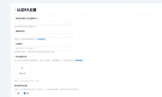 【如何认证主播并上榜】 第一步:进入KK推广员联盟官网,点击登陆。(*如无KK账号,则需先注册并登陆) 第二步:完成登陆后,可以看到认证成为主播的网页,需提交相关信息并提交。 申请入驻后,当天即可获取入驻申请结果。为避免主播们反复修改资料造成时间延长,K妹这边整理了一点过审小tips: ①提交主播证明时,需提交正确的直播间地址.直播间地址获取步骤如下: 直播间链接是kk玩家点击主播头像后跳转观看的链接,所以各位主播请一定要重视并上传正确的链接!避免出现玩家打不开链接等情况! 第四步:审核成功后点击【任务大厅】-【选图开播】-【经典游戏】-选择要入驻的专区后,点击【申请入驻】,当天即可成功入驻! 主播直播时,可进入后台点击【我要开播】按钮,平台会同步显示直播状态! 玩魔兽RPG地图,上KK对战平台!带你重回青春,再战WAR3二十年!已收录万张经典地图,一站式找图读图联机,畅玩海量经典怀旧游戏!点击链接下载,玩魔兽,就上KK! |