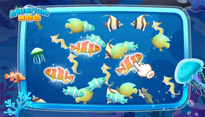 水族馆小鱼消除游戏,轻松欢快的游戏氛围,简单的消除玩法,玩家可以轻松上手体验哦。游戏中玩家将踏入一个水族馆中,各种Q萌的小鱼就是你消除的主要元素,快速点击屏幕中三个相同的小鱼就能实现快速消除,直到在最短的时间内将水族箱中的小鱼全部消除掉,游戏需要玩家有着良好的反应速度和手速。