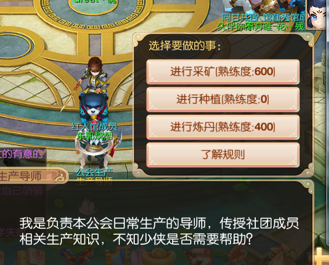 介绍:在游戏中,玩家日常中所需要的部分任务物品除了在商会跟摊位购买之外,还可以自己通过生产来自给自足。前提是有加入公会,并且有一定体力值。 进入方式:在主界面中点击右上角人物头像,点开主角界面,可以看到在气血下方有体力,隔壁就有一个公会生产按钮,点击之后系统会自己导航找到生产导师 生产规则: 1、消耗一定时间和体力可进行公会生产,产出日常所需的某些特定道具; 2、公会生产技能可自行选择类型,技能受熟练度和玩家等级影响。各个生产技能的熟练度相互制约,总熟练度不可超过1000 分类:生产分类三个种类,可以进行采矿,种植,炼丹,跟导师对话后会让玩家自行选择,每个分类后面都有熟练度数字提醒。 过程:时间为3个小时,可以点击让别人帮忙,每一次点击都会使时间减少一个小时,自己帮助别人点击也是帮别的玩家省下一个小时的等候时间哦,收获时间到了的话,物品系统会自动发到玩家邮箱上。 收获的物品就是任务物品,玩家可以拿着去交任务,如果不需要的话,也可以通过商会或者摊位的方式出售换银币。 [编辑:Cooper]