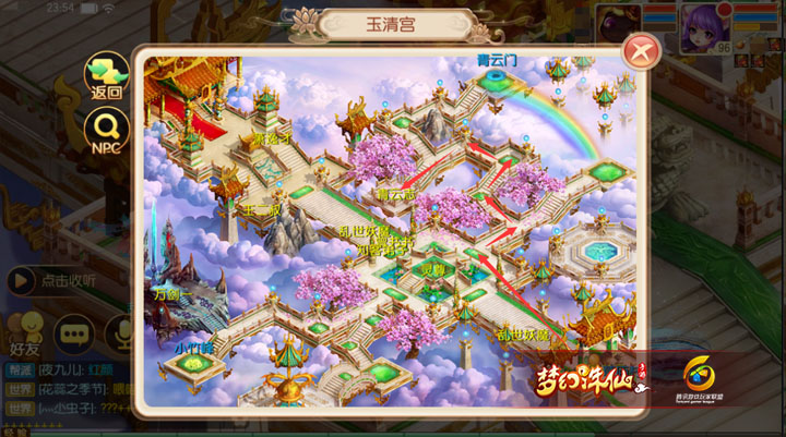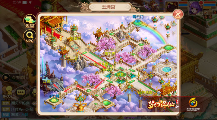 第五关用的是小竹峰的地图,手动路线与寻找NPC路线相同,BOSS狻猊在张小凡3字的右上方。 第六关使用的是十万大山的地图,非常简单,一条直线走过去就能看到BOSS霸下。 第七关用的玉清宫的地图,这算是整个九霄中最复杂的2张地图之一,如果记不住路线可以找前置NPC,BOSS狴犴在万剑一处, 第八关用的仍是玉清宫的地图,整个九霄最复杂的2张地图之二,落地点变了,在下方,BOSS螭吻在青云志处,路线如下: 第九关用的是蛮荒的地图,也是比较简单的直线走就可以了,注意靠边走不要点到石块岩层上方就行(实际点到了也没关系)。 第十关就不用多说,直接过去挑战就可以了,因决战九霄无法看到地图界面,所以用的是普通地图替代哦,路线都是一样的。 |