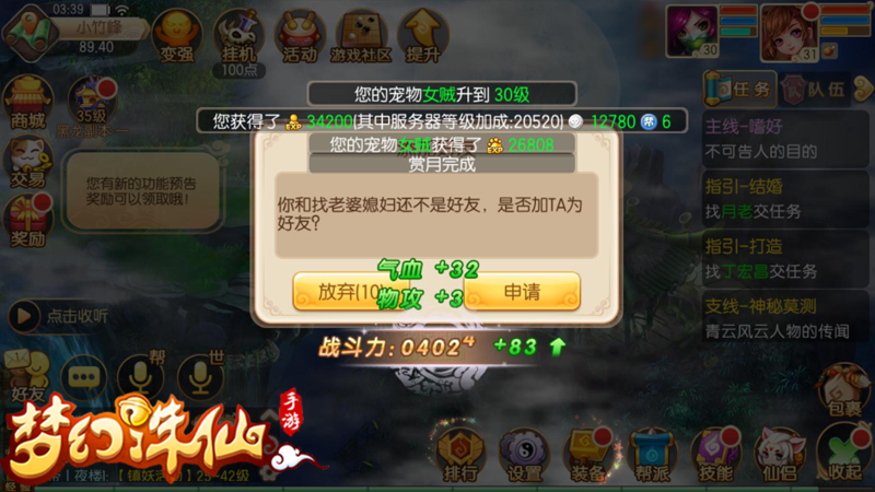 在《梦幻诛仙手游》中,有各种各样的社交活动,其中就包括赏月。赏月,解锁等级低,完成的条件也很简单,但却能获得大量的经验,而且还能拿到帮贡,因此属于推荐每日必做的任务之一。 赏月30级解锁 加入帮派才能体验 当玩家角色等级达到30级后,就可以解锁赏月系统。赏月系统可以在日常活动面板中快速参加,也可以在帮派系统中的帮派活动内点击参与。赏月只能和本帮派成员一起完成,而且必须要对方同意才能一起去赏月。 每日赏月获大量经验 帮助还能拿帮贡 赏月任务仅限2人一起参与,赏月地点是小竹峰望月台。玩家每日可多次参与赏月,但只有第一次完成赏月任务时可以获得大量经验和帮贡,宠物也能获得大量经验值,前五次帮助其他玩家完成赏月任务可以获得帮贡奖励。参与赏月时,系统会给出当前帮派在线玩家列表,只有非组队、巡逻状态下的帮派成员才能接受赏月,成功发起邀请后10秒内对方无回应才能继续发起赏月邀请。 赏月后可互加好友 亲密关系再进一步 赏月过程中,会有玫瑰爱心飘落,浪漫之后如果两人非好友关系,系统还会自动发起加好友提示。玩家可以选择放弃,也可以选择申请,申请后需对方同意才能成为正式好友。浪漫的赏月任务,还有可能促成更亲密的关系哟。 《梦幻诛仙手游》浪漫赏月任务,轻松拿大量经验值,还能促成社交,让亲密关系更进一步。 |