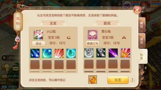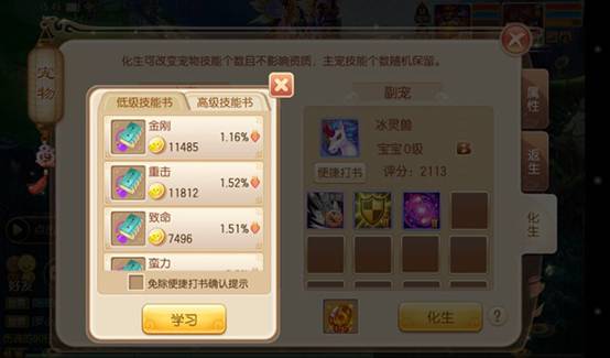 在梦诛中行走江湖,除了自身必备的一身技能、代步的坐骑、护身的法宝、赶路的飞行器以外,当然还要有一个贴心且能护主的宠物宝宝啦!兜妹在培养着自己的宠物的时候,居然发现宠物化生有了个小小的变化——便捷打书! 化生1 各位少侠在化生的时候肯定会遇到过这样的情况!就是主宠和副宠会有重复的技能,这样大大降低了化生多技能宠物的机会!这个时候我们就会对副宠进行技能学习,将重复的技能顶掉以后再进行化生。然而来来回回的给宠物学习技能的时候,记忆不好的少侠就比较头疼了,是不是已经没有重复的技能都要重新点化生才可以看到~ 不过现在不怕啦!直接点击便捷打书!可以直接选择想要给宠物学习的技能书,如宠物本身已经有的技能会提示已有该技能,就可以选择其他技能书来给宠物学习。 是不是方便快捷了许多!这样优化对于兜妹来说可真是省时间省脑力!并且更直接的能够看到是不是已经没有重复技能,可以进行化生了!相信对于各位少侠来说也是十分实用的一个优化吧! 化生5 你猜兜妹能化生出几技能呢!!不说了!各位少侠也抓紧去化生宠物,试试这个方便快捷的新技能吧! |