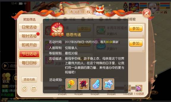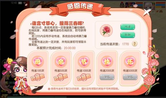 母亲节(Mother's Day),是一个感谢母亲的节日。这个节日最早出现在古希腊;而现代的母亲节起源于美国,是每年5月的第二个星期日。母亲们在这一天通常会收到礼物,康乃馨被视为献给母亲的花。 梦诛手游中每位少侠都可领养或生育子女,体验生儿育女的乐趣,同时也了解到了为人父母的不容易。母亲节将至,梦诛手游为各位少侠准备了温馨的节日活动,尤其对于女性玩家更有非常贴心的祝福哦,那么快随兜妹一起来看看吧! 【感恩传递活动】 活动等级限制:等级≥30级。 活动说明:将康乃馨传递给好友,即可获得奖励,全服传递达到一定次数,更可领取母亲节神秘大奖哦。 活动奖励说明:感恩传递将于每日零点结算,未领取的奖励将不可再领取。 【感恩传递活动玩法】 活动开启当日00:00,系统随机选定30级以上且在线的部分少侠,发送康乃馨,每人一朵。(未发到康乃馨的少侠会提示活动详情,可了解活动具体玩法,可等待好友传递) 收到康乃馨的少侠同时会弹出系统提示:“XX送您一朵溢满祝福的康乃馨,是否继续传递?” 少侠点击确认后,可选择对好友进行传递,并获得传递奖励。(康乃馨只能传递给好友,好友必须在线,等级在30级以上,而且今日未传递过康乃馨) 当少侠传递给自己的好友康乃馨时,好友收到后会弹出系统提示,好友也可选择是否继续传递。选择继续传递后可以继续往下传递,若得到康乃馨后一定时间不进行传递,系统会自动进行传递操作。 【感恩传递活动规则】 每位少侠每日仅可传递一次康乃馨,少侠选中一位好友,点击传递按钮,即可成功将康乃馨传递,传递成功则可获得奖励,同时活动主界面上的当前传递次数加一。 每朵康乃馨在少侠处存在时间不超过120秒,传递按钮下方显示当前可存放的时间倒计时。 若少侠120秒内无操作(不管是系统赠送还是好友赠送),倒计时结束时,则系统自动将该康乃馨传递给当前在线,等级30以上,并且未传递过的少侠(不限好友)。 系统赠送康乃馨有优先级区分,优先随机赠送符合条件(当前在线、30级以上、未传递过康乃馨)的好友,若没有符合条件的好友,则随机赠送给符合条件(当前在线、30级以上、未传递过康乃馨)的非好友少侠。 【感恩传递活动奖励】 全服康乃馨传递次数一共分为五个阶段,当全服康乃馨传递次数达到不同阶段时,所有少侠都可领取奖励。 若之前阶段不在线的少侠,上线后自动弹出领奖面板,只弹出当前传递次数最高阶段的领奖面板。 全服康乃馨传递次数达到一定次数后,少侠领取最后一阶段奖励时,可以获得母亲节贺卡。 母亲节贺卡可自由编辑节日祝福内容,编辑好后可发送至世界频道或帮派频道,发送后不仅可以获得贺卡奖励,还可将贺卡内容同步分享至微信好友、朋友圈、QQ好友、QQ空间。 在活动期间,每晚零点还会给拥有子女的女性玩家发送邮件祝福哦,并附上一份神秘礼物~ 谁言寸草心,报得三春晖! 以上就是梦诛手游母亲节温馨活动详情。浓情康乃馨,感恩母亲节!梦幻诛仙手游集结所有少侠在母亲节当天,向辛勤的妈妈道一声“谢谢”! 想了解更多《梦幻诛仙手游》相关信息,请前往叶子猪专区:http://www.yzz.cn/sy/mhzx/ |