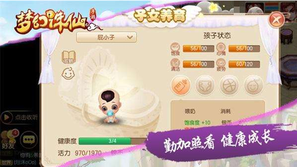 在与心爱的她(他)齐心协力努力下终于诞生了你们爱情的结晶,或是经过漫长的祈祷领养了自己可爱的孩子,面对这么可爱的宝宝怎么培养就成了问题,下面兜妹为少侠们介绍下婴儿期孩子的培养。 在孩子出生后会在家园中显示,少侠们点击孩子会在孩子头上显示操作界面,有养育、到我这来、逗乐、携带这四个选项。可以根据这四个选项做出具体的操作! 一、到我这来 点击到我这来可以调整孩子在家园中的具体位置,在途中如果有家具挡着孩子会停下,所以要给宝宝选择正确的线路哦。 二、逗乐 孩子有自己的动作,点击“逗乐”,随机播放孩子的动作,并且孩子脑袋顶上随机冒出对话泡泡,这样宝宝会很高兴哦。 三、养育 这里重点说的就是养育了,养成主要是:洗澡(清洁度),喂奶(饱食度),哄逗(心情)。 这里的每个操作都会消耗玩家钱币+活力,并且对应增加清洁度、饱食度、心情。 1、养育操作 点开养育点击图标选择需要执行的操作,点“开始养育”来执行养育,这里如果玩家的消耗的银币或者活力不够的话会提示不足请补充。当养育完成读条完成后,提示“喂奶成功,饱食+xxx,疲劳+xxx”。 2、疲劳值 每次养育会增加孩子的疲劳值,当疲劳值到达满值后,孩子需要睡觉。睡觉期间,不可以对孩子执行任何操作。睡觉期间,不可以对孩子执行任何操作。睡觉时间X小时。睡觉中途可以把孩子唤醒。唤醒后,疲劳根据睡了多少相应减少。 3、各项属性的增减 当然有增加就会有减少,饱食度,心情,清洁度,每小时减少X。(可以不一样)每天需要保证3个数值达到X以上,宝宝的健康度才是正常增加,否则会停滞不前哦。每天0点结算健康度,当健康度满了之后才能进入童年期哦,当健康满了之后需要点击“进入童年”将孩子升级到下一个阶段【童年期】。 经过兜妹的介绍,少侠们是不是对自己的小宝宝有更多的期待了呢,心动不如行动,快快去获取自己可爱的宝宝吧。 想了解更多《梦幻诛仙手游》相关信息,请前往叶子猪专区:http://www.yzz.cn/sy/mhzx/ |