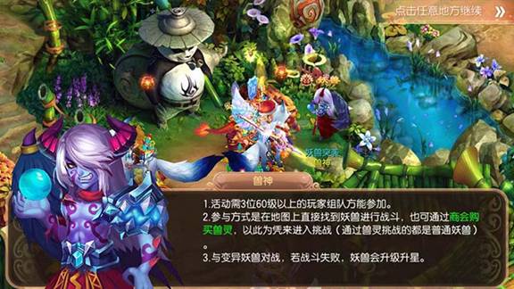 兽神禀天地戾气所生,生性嗜杀,被玲珑镇压。千万年后兽神死而复生,他又开始带领麾下的13妖王意图祸乱人间,为了维护人间安定,号召各位仙友击杀妖兽,如果仙友实力与智慧超群,战胜了妖兽,便可以获得他们给予的丰厚奖励。需要主要的是,妖兽也是分难度的,变异且星级高的妖兽难度比较大,请仙友有所准备。 【妖兽突袭(变异妖兽)】 活动时间:全天,在每个整点刷新 人数限制:3-5人,组队活动,少于3人组队无法参加 等级限制:最低60级 刷新地点:大王村、十万大山、蛮荒、天帝宝库、南疆、玄火坛、死亡沼泽等地图随机刷新 次数限制:每日可完成2次,超过2次无任何收益 【怪物阵容】 对战中妖兽排列两行,后面一行是主怪,前面一行小怪是主怪的宠物。战斗中,小怪会给主怪加血或者解封,主怪被击杀后不会消失,宠物被击杀随后的回合有几率被主怪再次召唤,继续给主怪加各种状态,十分难缠。 【完成方法】 1、每个整点前十分钟,组好队伍,搭配好队伍职业,最好的配置当然是圣巫+天音+焚香(青云)+鬼王+合欢。天音和圣巫为必备职业,尤其是挑战高星变异妖兽,职业搭配更重要。队伍成员准备好药水,尤其是解封药和复活药。 2、找到妖兽 整点刷新后,队长带领队伍前往各刷新地图,找到妖兽怪物。 3、击杀妖兽 找好后,点击进入战斗,由于妖兽击杀难度高,所以战斗中请使用手动模式,并听从队长指挥。 战斗开始后,首先我方圣巫要对封印类怪物进行封印,如果有两个封印怪物,则天音可以使用嘲讽另外一个封印类怪物。 接下来优先集火击杀物理系怪物,然后才是法术系怪物。如果有天音系怪物,需要优先击杀,不然不停的使用加血技能,击杀难度会加大。 最后击杀封印类怪物,然后群体攻击击杀小怪。 【变异妖兽升星方法】 变异妖兽有1-9星,1星最低,9星最高,当队伍击杀变异妖兽失败或者全体队员逃跑成功后,则妖兽会升高一星,一直可以升到9星。 要注意的是,在升星过程中,防止其他玩家夺取胜利果实,因为妖兽是每个队伍都可以打的,谁先抢到就是谁的。 【活动奖励】 1、普通奖励: 除了获得高额的经验外,还有概率获得镇灵石、洗魂珠、返生丹、启灵珠等道具。 2、稀有奖励: 概率获得三四级护符、一二级洗练石、高级宠物技能书、超级宠物技能书。 【妖兽突袭(普通妖兽)】 普通妖兽有别于变异妖兽,普通妖兽无刷新时间,全天都可以进行挑战。 普通妖兽可以找南疆兽神进入挑战,每次挑战需付出一个兽灵道具。 普通妖兽怪物的类型、打法、奖励都和变异妖兽一致,但难度会大大降低,同时获得稀有物品的概率也会有所降低。 玩家可以根据自身实力选择挑战普通妖兽或者变异妖兽。