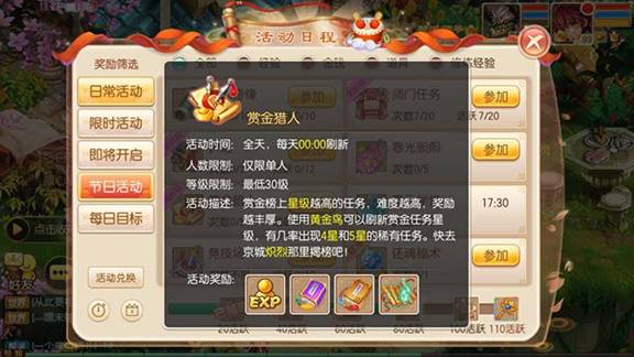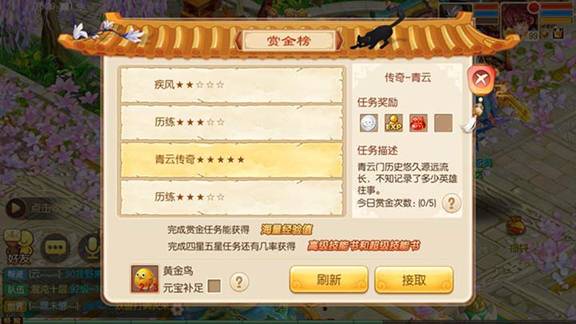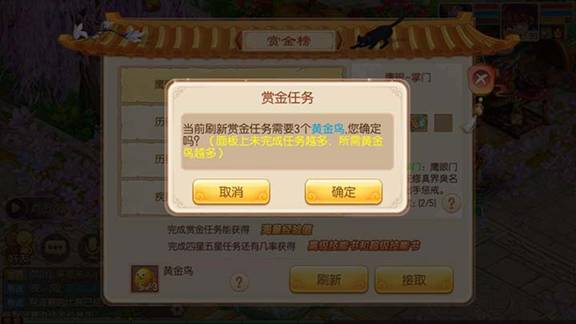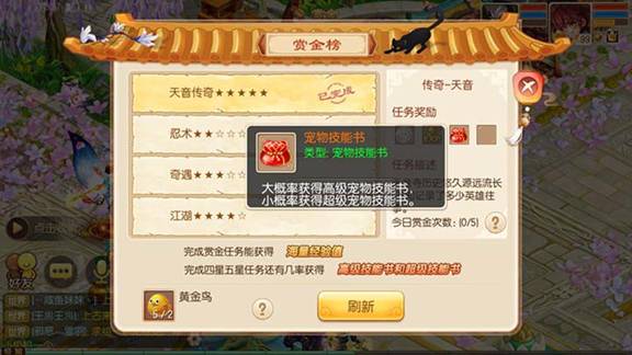 赏金猎人任务在梦幻诛仙手游中是高收益日常任务之一,超高的角色经验奖励和相对简单易完成的任务模式,是玩家每天不可错过的任务之一。 【赏金任务】 “赏金榜”位于京城,每日零点刷新任务次数,玩家只需点击任务系统就会自动将你引导至赏金榜。 赏金任务接取限制:等级达到30级才可接取,单人任务。 赏金任务次数限制:每人每天最多可以完成5次。 赏金任务放弃:赏金任务可以放弃,但是放弃会使当日赏金任务可接次数减少。 赏金任务描述:赏金榜上星级越高的任务,难度越高,奖励越丰富。使用黄金鸟可以刷新赏金任务星级,有几率出现四星和五星的稀有任务。 【赏金任务分类】 赏金任务一共分为1星任务、2星任务、3星任务、4星任务和5星任务。1星最简单,5星最难,但也有星级越高,越简单的任务。每个星级的任务种类不同,需要击杀的怪物也不同。 1星-2星任务:有“历练”、“疾风”、“忍术”等任务类型 3星-4星任务:有“历练”、“奇遇”、“江湖”等任务类型。 5星任务:有“奇遇”、“飞天”、“门派传奇”等任务类型。 其中“疾风”、“江湖”、“飞天”等任务需要击杀指定的怪物;“奇遇”需要上交指定的物品;“门派传奇”需要和各门派掌门对话。 【赏金任务完成】 从“赏金榜”接取任务后,会自动寻路至任务地点,击杀怪物、上交物品或对话即可完成,完成后会自动寻路至“赏金榜”处。 【赏金任务刷新】 因为不同星级的赏金任务之间奖励存在差距,而这里的差距指的并不仅仅只是经验、银币的收益,建议玩家尽可能的去接高星级的任务。 “赏金榜”上任务一次最多可以显示4条任务,使用道具“黄金鸟”可以刷新赏金任务。 当“赏金榜”上未完成任务剩余4个时,需要使用3个黄金鸟刷新。 当“赏金榜”上未完成任务剩余3个时,需要使用2个黄金鸟刷新。 当“赏金榜”上未完成任务剩余2个时,需要使用1个黄金鸟刷新。 当“赏金榜”上未完成任务剩余1个时,可以免费刷新。 当“赏金榜”上未完成任务剩余0个时,自动刷新。 【赏金任务奖励】 赏金任务会奖励丰厚的经验,除此之外,根据星级不同,高星级任务还会奖励宠物技能书,甚至运气好可以得到超级宠物技能书。 1星-2星任务:奖励略低,只有少量的经验和银币。 3星任务:除了经验和银币,还会奖励鬼谷残卷。 4星任务:大量经验和银币,大概率获得低级宠物技能书,小概率获得高级宠物技能书。 5星任务:大量经验和银币,大概率获得高级宠物技能书,小概率获得超级宠物技能书。 4星和5星任务还有额外概率获得返生丹、子女道具、完整阵法书等奖励。