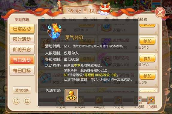 在梦诛世界里,等级是非常重要的,快人一步,将会获得极大的优势,在首席争霸、七脉会武、天下会武、世界BOSS、竞技场、上古战场等活动中会获得很好的名次,也会获得不错的奖励。 不过有很多少侠会因为种种原因而错过了每天的活动和任务,导致每日获得的经验减少,等级跟不上梯队。 也会有不少少侠会选择开区比较早的服务器进入,在等级上的差距就更大了。 而灵气封印任务的到来,简直是以上少侠的福音,可以快速的帮助符合条件的少侠提升等级。 【灵气封印任务】 灵气封印任务可以帮助符合条件的玩家快速成长。在京城NPC“木木”处接取,坐标在护送NPC“金瓶儿”上方。 1、人数限制:单人 2、等级限制:最低60级 3、活动时间:全天,领取后72小时之内只可以进行一次本活动。可以重复完成,3天可以完成一次。 4、领取条件:服务器等级65以上;玩家等级大于60级,小于等级榜100名等级-3 等级榜100名等级:玩家可以查看所在服务器排行榜最后一位的等级,以最后一名等级减去3级,为符合条件的玩家。 举例说明:本服务器等级榜最后一名等级为80级,符合条件的玩家等级在60《玩家等级《77级。 【灵气封印任务怎么做】 找到接取NPC后,点击NPC接取灵气封印任务,会跳出任务界面。任务界面会显示灵气封印说明以及被封印住的灵穴。 1、封印的灵穴共有十个,按顺序排列组合。 2、点击被封印的灵穴可以解封灵穴,解封后即可领取奖励,但是解开的封印越多,获得的奖励也越多。 3、解封必须按顺序解封,无法跳过关卡。 【灵气封印任务付出和回报】 1、付出 问:灵穴解封如何解封? 答:需要金币。 问:需要多少金币呢? 答:每一关卡需要金币45000。 问:每一关的耗费金币是否一样? 答:一样的。 问:十关共需要多少金币? 答:共45W金币 2、回报 灵气封印任务的奖励是经验,获得的经验奖励非常丰厚。 根据等级不同和服务器加成不同,灵气封印任务每关的经验奖励也会不同。 以70级左右的玩家举例,完成一关获得的经验奖励在35W左右,完成十关的经验奖励在350W左右(计算服务器等级加成)。 想了解更多《梦幻诛仙手游》相关信息,请前往叶子猪专区:http://www.yzz.cn/sy/mhzx/