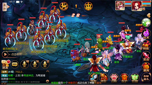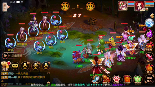 敌方阵容为前排三个毒虫,后排两个毒虫、两个吸血妖蝠、姜老三,共8个敌人。这关前方三个毒虫会使用群体的法术技能攻击,伤害一般,也会变成吸血妖蝠,变身回合不能攻击。后方最左边的毒虫会治疗,最右边的毒虫会封印,血量不多,可以优先击杀。左边的吸血妖蝠会双龙旋和炎龙啸,右边的妖蝠和姜老三会落花听雨和移花接木,伤害比较高,建议集火一个个击杀。另外姜老三貌似会让手下分担伤害,所以可以先杀其它怪物先。