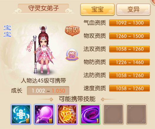 守灵女弟子普通物攻类宝宝,45级可携带,人形宝宝,穿着粉红色的无袖连衣短裙,配一双粉色长靴,手拿一根长棍,扎起一条马尾,带着头环,看起来不像是守灵的,倒是像粉红色的青春偶像少女。物攻、物防资质都相对较高,气血资质则比法攻、法防、速度略高,后面三种资质一样。可能携带技能,高级幸运,不受到物理重击、法术暴击,7.5%几率躲避法术;高级再生,战斗中每回合结束时恢复等级*1.2的气血;剑荡八荒,物理群体技能,初始可同时攻击两个目标,达到60级后可以同时攻击三个目标,无法触发吸血和连击;忠心,不会逃跑,不会受强迫效果影响,增加自身等级*0.3的攻击力。高级幸运加高级再生,配上队伍中有天音的情况下,抗打能力比较好,忠心也确保了守灵女弟子不会给打跑及受强迫影响,保证了持续输出。