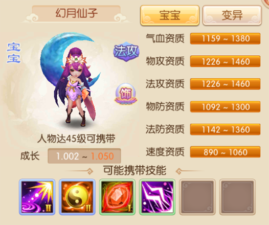 幻月仙子普通法攻类宝宝,45级可携带,头发同样扎着长长单马尾,头上戴着一个类似的头带,身穿浅蓝色短裙,背着一个大月亮,尖耳朵,像是一个精灵妹子。物攻、法攻资质同样最高,其次到气血、法防资质,物防资质略低一些,最低资质是速度。可能携带技能,高级法术剧烈,法术攻击伤害结果在原基础上会有80%至130%的波动;高级固法,提升等级*1.1的法术防御,但物理伤害结果会降低10%;凝神,可以抵挡封印类异常状态,伤害能力降低20%,同时受到的伤害减少1%;雷击雷系单体法术技能,同时有10%概率驱除对方的一项增益状态。虽然这个精灵妹子物攻和法攻资质一样,就以为是个物法双修的宝宝,从技能来看,幻月仙子是个典型的法攻宝宝,高级法术剧烈能使幻月仙子爆出极高的伤害,同时也能减低伤害,比较看人品的技能,高级固法使其有极高的法术防御,凝神能克制封印类技能,是个能抗能打的妹子。