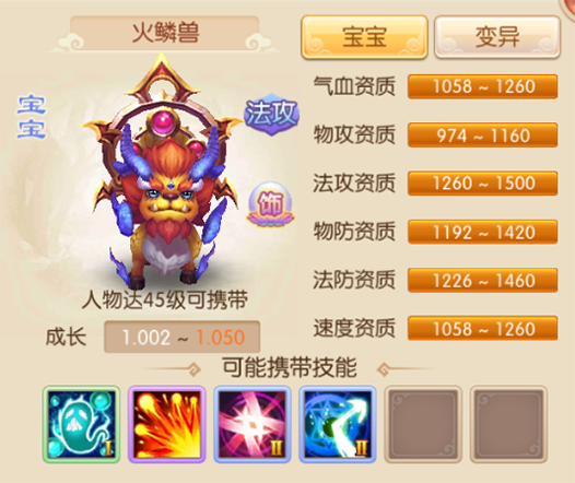 火鳞兽普通法攻类宝宝,45级可携带,形象类似麒麟,背上飘着一个圆环类的东西,其实看脸像只狗狗。法攻资质最高,其次是法防、物防资质,气血、速度、物攻资质较低。可能携带技能,驱鬼,对拥有鬼魅类技能的单位物理、法术伤害效果增加50%,如果将鬼魅类怪物打死,对方将飞出场外而不能复活;地狱烈焰,火系群体法术技能,初始可同时攻击两个目标,达到60级后可以同时攻击三个目标。同时有概率降低对方物理和法术防御5%,持续 3回合;高级冥思,战斗中每回合结束时恢复等级*0.75点法力;高级魔法反击,受到物理攻击30%几率进行魔法反击,伤害为正常值的70%。感觉火鳞兽在法术输出方面不及幻月仙子,高级冥思战斗作用不大,地狱烈焰和高级魔法反击效用不错,能克制鬼魅类宠物,比较不错的宝宝。
