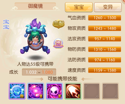 御魔镜是普通血耐类宝宝,55级可携带,在一面漂浮的镜子里,伸出上半身,头顶带着一根较大的骨头和一个较小的骷髅头,一手叉腰一手拿着头发,似乎在好奇看着什么东西。资质从高到低物防、气血、物攻这三种资质都比较高,速度资质相对不高不低,法攻、法防资质较低。可能携带技能,超级坚韧,提升*1.4的物理防御,但法术伤害结果减低10%;高级金睛,物理命中率提高3%,可攻击隐身目标对拥有隐身、高级隐身或者超级隐身技能的单位伤害结果增加12.5%;高级鬼魅,死亡4回合复活。不受任何状态影响,但也不能使用主动技能恢复气血;重击,物理攻击是增加暴击概率10%。御魔镜物理防御比较好,能复活和反隐,也有一定输出。