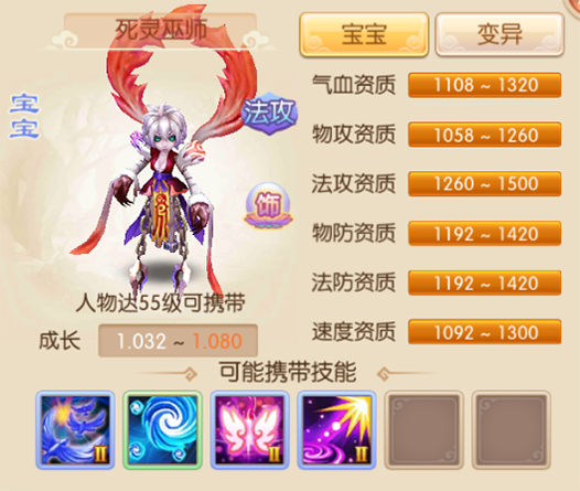 死灵巫师是普通法攻类宝宝,可55级携带,人形宝宝,没有脚漂浮空中,穿着像邪教人员,有着一双黑色尖指甲的大手或者说爪子,白色短发,看起来像男的,不过好像有胸,应该是个女性。法攻资质最高,其次是物防、法防资质,再到气血、速度资质,物攻资质最低。可能携带技能,高级飞行,飞行生物,物理躲避增加10%吗物理命中增加12.5%,战斗中速度增加7.5%;风袭,风系单体法术技能,同时有10%概率减低对方命中5%,持续3回合;高级重生,死亡时,有25概率自动复活并恢复75%的气血。与鬼魅类技能共存时,重生技能无效;高级法术剧烈。死灵巫师相对来说,技能效果偏向于先手输出,伤害靠人品。