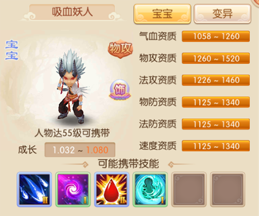 吸血妖人是普通物攻类宝宝,55级可携带,人形宝宝,头上长着一对牛角,刺猬头,背后挂着多把短剑,穿着像个农家少年。物攻资质最高,其次到法攻资质,物防、法防、速度资质一样,最次到气血资质。可能携带技能,高级连击,普通物理攻击时50%的几率对目标连续物理攻击2次,造成物理伤害结果降低20%;技巧,不会受到反击、魔法反击、招架和反震效果的影响,并提高宠物5%的物理伤害结果;物理攻击可吸取对方所掉气血的25%,对拥有鬼魅技能的单位无效;偷袭物理攻击忽视对方5%的物理防御。吸血妖人拥有比较强的物理攻击技能,吸血能较好续航输出,整体性能不错。