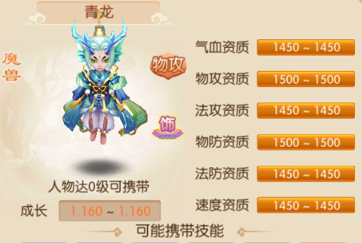 青龙神兽物攻类宝宝,身着传统古装汉服,头上有两根蓝色龙角,白色长发束在一起,漂浮在空中,样子比较俊朗。资质达到1500的有物攻、物防,其余的资质都有1450。可能携带技能,高级幸运,不会受到物理重击、法术暴击,7.5%几率躲避法术;特有技能-双刃击,主动使用,70%概率造成双倍的物理伤害,30%概率为目标恢复气血;高级追击,普通物理攻击时,物理攻击目标倒地进行追击,造成的伤害结果为正常的75%;迅捷,进入战斗后,自身受到增加10%;技巧,不会受到反击、魔法反击、招架和反震效果的影响,并提高宠物5%的物理伤害结果。