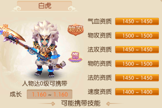 白虎神兽物攻类宝宝,身穿一条白色裤子,虎头腰带,肩膀两边有护甲,裸露上身,手拿一把长柄巨斧,有一条尾巴,白色披头散发,样子刚毅英气。资质达到1500的有物攻、物防,气血、法攻、法防资质为1450,速度为1400。可能携带技能,高级保命,如果被攻击后会死亡,则有35%几率报名,保留1点血。与重生和鬼魅共存时保命无效;特有技能-血性狂暴,以150%的物理伤害攻击敌人,自身损耗相应伤害结果20%的气血,气血低于上限30%是无法使用;高级坚韧,提升等级*1.1的物理防御,但法术伤害结果会降低10%;忠心,不会逃跑,不受强迫效果影响,增加自身等级*0.3的攻击力;偷袭,物理攻击时忽视对方5%的物理防御。