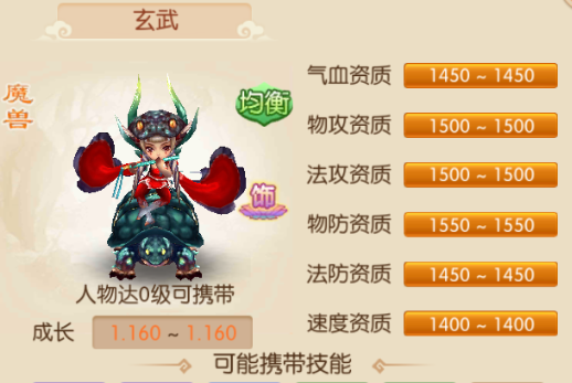 玄武神兽均衡类宝宝,比较少有的类型宝宝,貌似是个穿着红色衣服妹子,坐在一个大乌龟上,戴着一顶蛇头外形的帽,吹着笛子,看样子比较休闲。资质最高为1550的物防,然后是1500资质的物攻、法攻,再到1450资质的气血、法防,速度资质最低为1400。特有技能-亡魂刻印,主动使用,造成物理伤害,有10%概率让目标获得死亡印刻状态,死亡后不能被复活,持续6回合;超级坚韧,提升等级*1.4的物理防御,但法术伤害结果会降低10%;高级迅捷,进入战斗后,自身速度增加15%;金睛,可攻击隐身目标并对拥有隐身、高级隐身或超级隐身技能的单位伤害结果增加10%;蛮力增加自身等级*0.6的攻击力,如果对方有坚韧、高级坚韧或超级坚韧技能,物理伤害结果会减少20%。