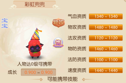 彩虹兜兜神兽物攻类宝宝,一只小羊,返生可以变幻多种不同色彩,戴着一个彩色圆锥形的帽子,像在过生日会,样子可爱。资质达1400以上从高到低为物攻、物防、速度,资质1300以上只有气血,1200以下为法攻、法防。可能携带技能,高级坚韧,提升等级*1.1的物理防御,但法术伤害结果会降低10%;高级幸运,不会受到物理重击、法术暴击,7.5%几率躲避法术;连击,普通物理攻击时45%的几率对目标连续物理攻击2次,造成物理伤害结果降低25%;重击,物理攻击时增加暴击概率10%。 彩虹兜兜作为一只神兽比包括35级普通类宝宝技能资质都要好,有两个高级防御技能,两个不错的物理攻击技能,是首次充值赠送的宝宝,基本每个玩家开始都可以考虑冲几块钱,拿个彩虹兜兜也是不错的选择。