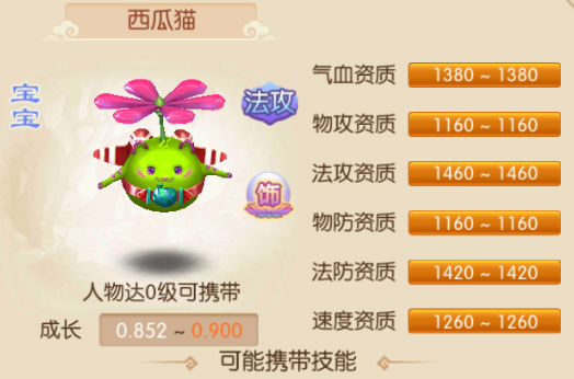 西瓜猫神兽法攻类宝宝,一只会飞的猫,虽说是猫,但体型圆滚滚的像个球,背着一个红色的喷射器,头顶有一个螺旋桨转着,样子也好可爱。资质达到1400有法攻、法防,1300的只有气血,1200的只有速度,1100有物攻、物防。可能携带技能,雷击,雷系单体法术技能,同时有10%概率驱除对方的一项增益状态;风袭,风系单体法术技能,同时有10%概率降低对方命中率5%,持续3回合;怒火,法术攻击时,10%几率造成暴击。 西瓜猫宝宝有两招主动单体法术技能,而且还附带其它效果,配上怒火的法术暴击,虽然只有三招技能和整体资质不高,但是技能性能不错,不过该宝宝是官网特权预约才能赠送的,所以不是每个玩家都有。