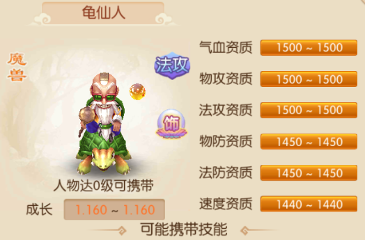 龟仙人神兽法攻类宝宝,一个骑着大乌龟,背着龟壳,拿着一把木杖的老头,出处就和名字一样明显是七龙珠里面悟空的师傅,一个猥琐但强大的色老头。资质达到1500的有三项气血、物攻、法攻,1400以上的也有三项物防、法防、速度。可能携带技能,水漫金山,水系群体法术技能,初始可同时攻击两个目标,达到60级后可以同时攻击三个目标。同时有5%概率降低对方物理和法术攻击力3%,持续3回合;超级法穿,法术攻击时忽略对方10%的法术防御;高级丧胆,攻击命中时有8%概率降低目标物理攻击5回合,该效果不能叠加;魔法反击,受到物理攻击30%几率进行魔法攻击,伤害为正常伤害的50%;高级固法,提升等级*1.1的法术防御,但物理防御伤害结果会降低10%。 龟仙人资质可以讲是非常好,各个方面都不不差,均比较高。技能也不错,有五个技能,主要以一个群体法术技能为输出,拥有超级法穿,使得龟仙人法术输出更胜一筹,高级丧胆以后可以不要,主要换上一些法伤和防御性被动技能,例如超级法术连击、超级法伤、超级强壮,基本上后期可一直带着的宝宝。龟仙人整体性能很好,但龟仙人是之前中秋节时活动获得的,所以目前在玩的玩家基本都会有,正式开服后不知道还可不可以在其它活动中获得。 精彩不容错过,更多的精彩攻略请继续关注叶子猪!