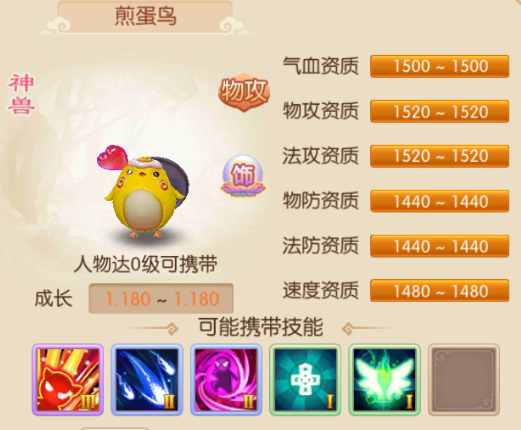 煎蛋鸟神兽物攻类宝宝,外形是一只幼年小鸡,背着一个平底锅,锅里和头顶都有一块煎蛋,看起来比较滑稽。资质达到1500以上的有气血、物攻、法攻,其中气血资质最差,不足1500达到1400以上的有物防、法防、速度,其中速度资质最好。可能携带技能,超级追击,普通物理攻击时,物理攻击目标倒地后进行追击,造成的伤害结果为正常的100%;高级连击,普通物理攻击时50%的几率对目标连续物理攻击2次,造成物理伤害结果会降低20%;高级偷袭,物理攻击时忽悠对方7.5%的物理防御;幸运,不会受到物理重击、法术暴击,5%几率躲避法术;重生,死亡时,有20%概率自动复活并恢复50%的气血。与鬼魅类技能共存时,重生技能无效。 煎蛋鸟身为神兽各方面的资质都不错,全是被动技能,其中有三招不错的物理攻击技能,幸运和重生提高了宝宝的生存能力,但是感觉输出能力不是好充足,需要学习其它物理输出技能来提高伤害。
