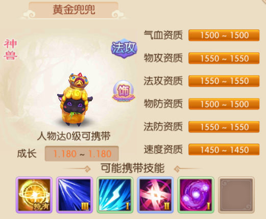 黄金兜兜神兽法攻类宝宝,黄金毛色的小羊,戴着皇冠,基本外形同兜兜一个样。资质最好为1550有三项物攻、法攻、法防,其次到1500资质的气血、物防,速度最差为1450资质。可能携带技能,特有技能-黄金滚滚,强雷系群体法术技能,消耗目标法力值,初始可同时攻击两个目标,达到60级后可以同时攻击三个目标;超级法术连击,法术攻击时,有35%概率追加一次60%伤害结果的相同攻击;法穿,法术攻击时忽略对方5%的法术防御;高级冥思,战斗中,每回合结束时恢复等级*0.75点法力;金睛,可攻击隐身目标并对拥有隐身、高级隐身或超级隐身技能的单位伤害结果增加10%。 黄金兜兜特有技能-黄金滚滚是招很不错群攻法术技能,配上超级连击和法穿,使得黄金兜兜有非常好法术输出性能,还能克制隐身单位。资质上除了速度差点,其余都很不错,后期技能主要学习增加法术输出的技能,突出黄金兜兜的法术输出效用。