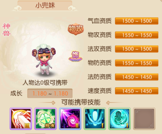 小兜妹神兽物攻类宝宝,看名字以为和兜兜一样都是一只羊,其实是个人形宝宝,套着白色羊外套,像是在cosplay一只羊的小妹妹。资质达到1550的有物攻、物防,其次到资质1500的气血、法攻,最后是资质1450的法防、速度。可能携带技能,超级重击,物理攻击时增加暴击概率20%;特有技能-幸运物语,主动使用,75%概率造成双倍的物理伤害,25%概率为目标恢复气血;高级技巧,不会受到反击、魔法反击、招架和反震效果的影响,并提高宠物7.5%的物理伤害结果;律令,使用技能时所消耗的法力减少30%;偷袭,物理攻击时忽视对方的物理防御。 小兜妹的特有技能类似双刃击,但出伤害和恢复的概率相对增加5%和降低5%,技能效果比较好。幸运物语如果加上超级重击的效果,伤害能达到很高,推荐学习连击和偷袭类技能。