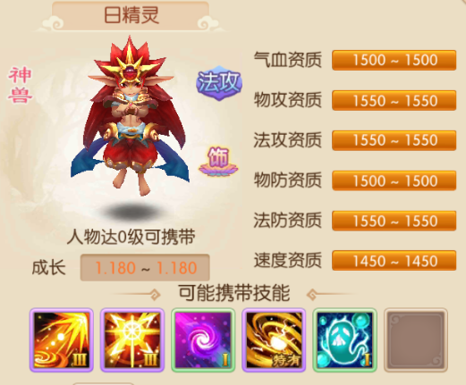 日精灵神兽法攻类宝宝,人形宝宝,漂浮在空中,长长的刺猬型头发,下身穿着裤子上身裸露,双肩披着肩甲抱着双手,样子比较帅气。资质达到1550的有物攻、法攻、法防,达到1500资质的有气血、物防,接着是1450资质的速度。可能携带技能,超级法术剧烈,法术攻击伤害结果在原基础上会有60%至150%的波动;超级怒火,法术攻击时,20%几率造成暴击;技巧,高级技巧弱化版,提高宠物5%的物理伤害结果;特有技能-烈日灼心,超强火系单体法术技能,同时有30%概率降低对方物理和法术防御力10%,持续3回合;驱鬼,对拥有鬼魅类技能的单位物理、法术伤害效果增加50%,如果将鬼魅类怪物打死,对方将飞出场外而不能复活。 日精灵拥有超级法术剧烈和超级怒火,在配上烈日灼心,若运气好,其输出伤害将会非常恐怕,推荐主要学习加强法术伤害的技能及毒类技能提高输出的稳定性和伤害。