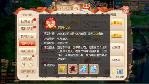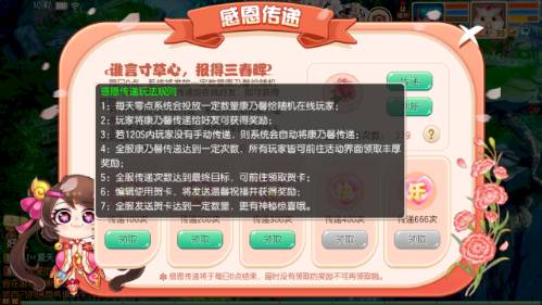 每天零点在线的玩家会随机获得康乃馨,将康乃馨在限定时间内传递给好友便可获得奖励,如若超时将自动被传递出,全服传递的次数达到一定时便可领取相应的奖励,最终可获得一张卡片,将卡片发送出去,达到一定数量时更有神秘惊喜哦!