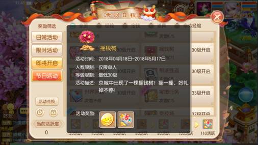 活动期间每天可在京城的摇钱树处摇一摇,从而获取奖励,每人每天仅可摇一次。