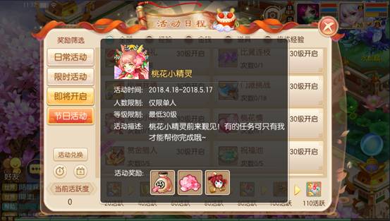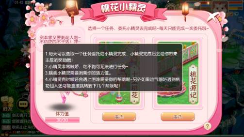每天都可对小精灵进行一项委托,但是小精灵要填饱肚子才会去执行委托哦,而给小精灵投喂是会消耗一定的活力的。小精灵在执行委托的过程中,遇到了麻烦是需要少侠们去帮助她一起完成的,如果运气好的话会遇到桃花仙人哦,巧遇桃花仙人是会有╰(*°▽°*)╯惊喜的呢!