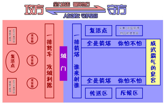 战斗开始后,进入到攻城战活动地图,该地图的各个功能区布局如下所示: