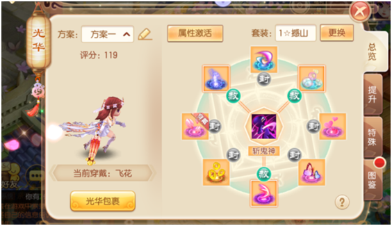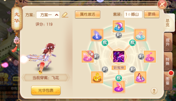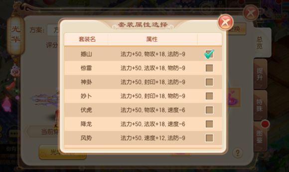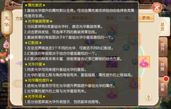 如果少侠将八种基础光华均提升到1星以上便可激活套装属性,套装属性也是可以根据自己的职业和需求自由选择效果的呢!(光华套装的级别取决于八大基础光华中最低的级别)